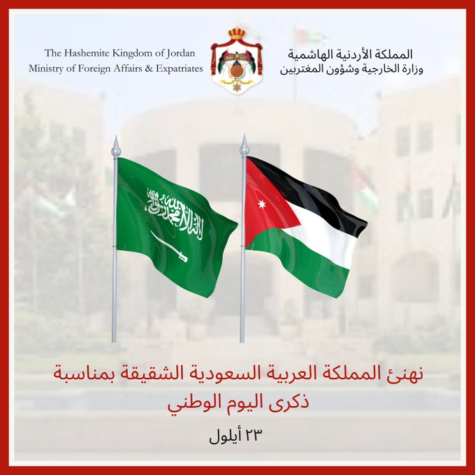 عمان جو- هنأت وزارة الخارجية وشؤون المغتربين اليوم المملكة العربية السعودية الشقيقة بمناسبة اليوم الوطني الذي يوافق ٢٣ أيلول. وأرفقت الوزارة عبر حسابها الرسمي على منصة أكس صورة تهنئة للملكة العربية السعودية: