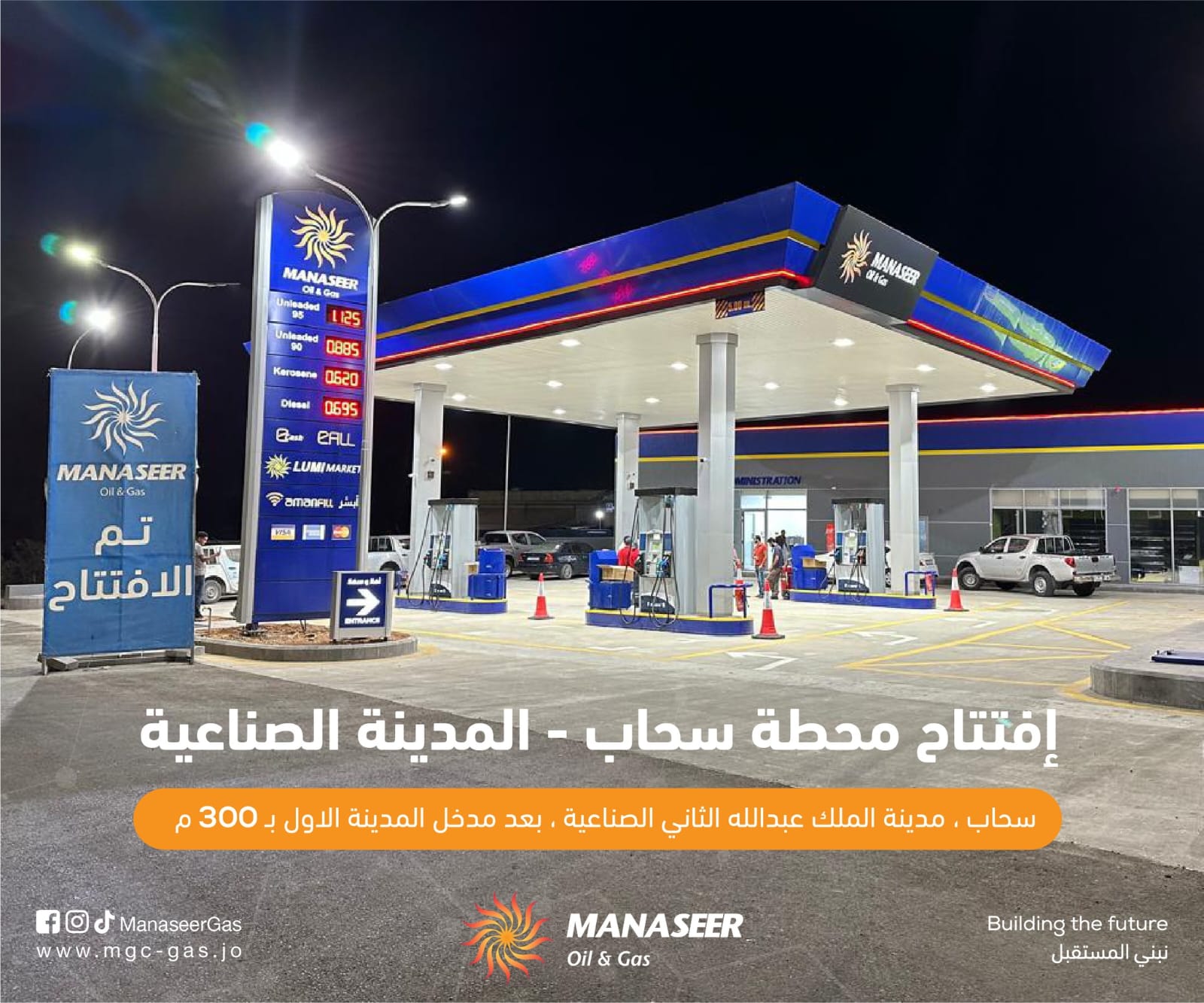 عمان جو - ضمن إستراتيجية شركة المناصير للزيوت والمحروقات بالتوسع والإنتشار في كافة أنحاء المملكة الاردنية الهاشمية، تم بعون الله افتتاح محطة وقود جديدة تابعة للشركة تقع ضمن اقليم الوسط في عمان ، سحاب ، مدينة الملك عبدالله الثاني الصناعية ، بعد المدخل الاول بـ 300 متر. ليصبح عدد محطات المناصير العاملة في أقليم الوسط يزيد عن 65 محطة وفي جميع انحاء المملكة ما يزيد عن 109 محطة لضمان أكبر تغطية جغرافية ولضمان تقديم أفضل الخدمات للجمهور وللعملاء.