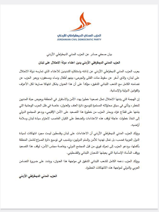 يعرب الحزب المدني الديمقراطي الأردني عن إدانته واستنكاره الشديدين للاعتداء الذي تمارسه دولة الاحتلال على لبنان، والذي أسفر عن سقوط مئات القتلى والجرحى، بينهم أطفال ونساء ومسعفون، ويعبر الحزب عن تضامنه الكامل مع الشعب اللبناني الشقيق، مؤكداً على أن هذا العدوان يشكل انتهاكا صارخا لكل الأعراف والقوانين الدولية والإنسانية.