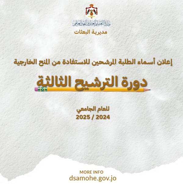 عمان جو - أعلنت مديرية البعثات في وزارة التعليم العالي والبحث العلمي اليوم الأربعاء الموافق 2-10-2024 أسماء الطلبة المرشحين للاستفادة من المنح الخارجية للعام الجامعي 2024-2025 ضمن دورة الترشيح الثالثة، وذلك من خلال الموقع الإلكتروني لمديرية البعثات على الرابط التالي www.dsamohe.gov.jo حيث تم إرسال رسائل نصية للطلبة المرشحين على أرقام الهواتف الخلوية التي قاموا بتخزينها عند تقديم الطلبات.