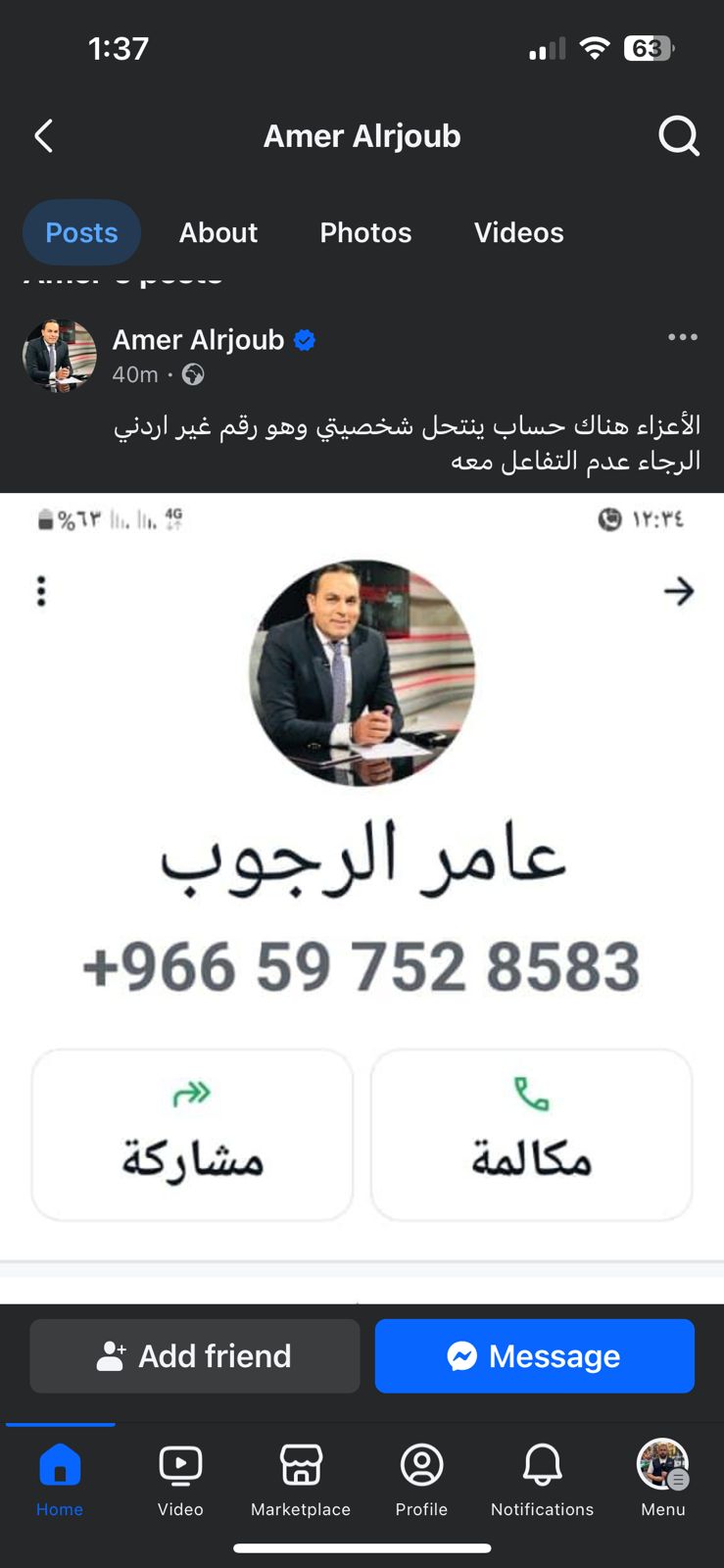 عمان جو - نشر الزميل عامر رجوب مقدم برنامج صوت اللملكة عبر صفحته الشخصية في منصة "فيس بوك " أن هنالك رقم غير أردني ينتحل شخصيته ، وطلب الرجوب عدم التفاعل معه