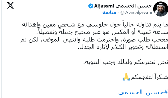 عمان جو -أصدر الفنان الإماراتي حسين الجسمي توضيحًا حول الجدل الذي أثير بعد نشر صورة تجمعه مع مدون السفر الإسرائيلي إيتسيك بالاس. وفي تدوينة عبر حسابه الرسمي على منصة "إكس" ، أكد الجسمي أن المعلومات المتداولة حول جلوسه مع بالاس وإهدائه ساعة ثمينة هي "غير صحيحة جملةً وتفصيلاً".