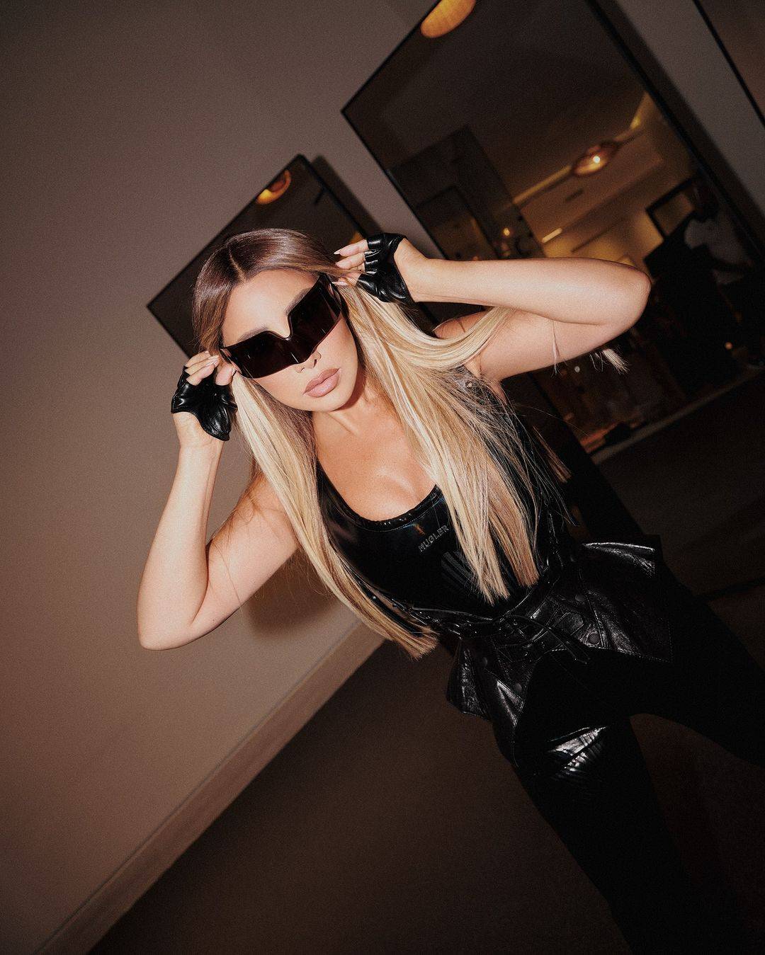 اختارت نجوى كرم أيضاً نظارات شمسية سوداء ذات تصميم فريد وموديل معكوس، وهو ما أضاف لمسة من السحر والتميّز لإطلالتها. أما من الناحية الجمالية، فقد تركت شعرها الأشقر الطويل ينسدل على ظهرها، في حين طبّقت مكياجاً ناعماً يعتمد على الألوان الترابية والبرونزية، مع أحمر شفاه بني اللون، مما أبرز جمال ملامحها.