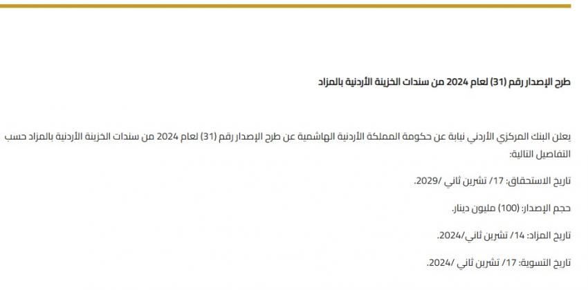 طرح البنك المركزي الأردني نيابة عن الحكومة،اليوم الخميس، الإصدار رقم 31 لعام 2024 من سندات الخزينة الأردنية بالمزاد بقيمة 100 مليون دينار.