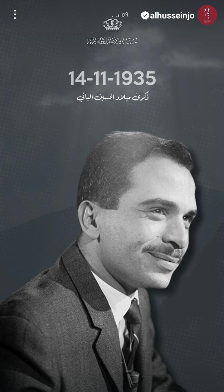 عمان جو-نشر سمو ولي العهد الأمير الحسين بن عبدلله الثاني اليوم عبر خاصية الستوري على الانستغرام صورة لجلالة الملك الراحل الحسين بن طلال تتضمن تاريخ مولد جلالته الموافق 14-11-1935.