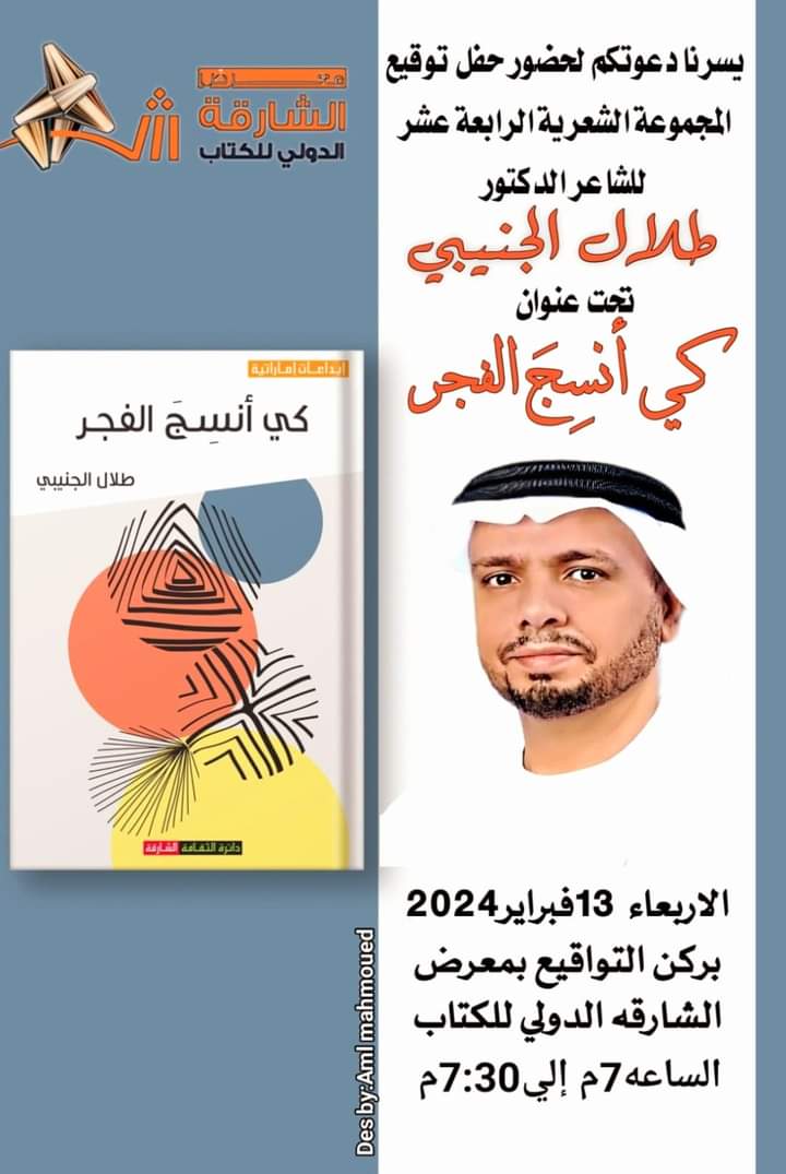 ضمن فعاليات معرض الشارقة الدولي للكتاب في دورته الثالث والأربعين التي بدأت فعالياته من ٦ حتى ١٧ تشرين الثاني،. وقع الدكتور الشاعر الإماراتي طلال الجنيبي مجموعته الشعرية الرابعة عشر ( كي أنسج الفجر) بحضور حشد كبير من المثقفين والشعراء العرب .