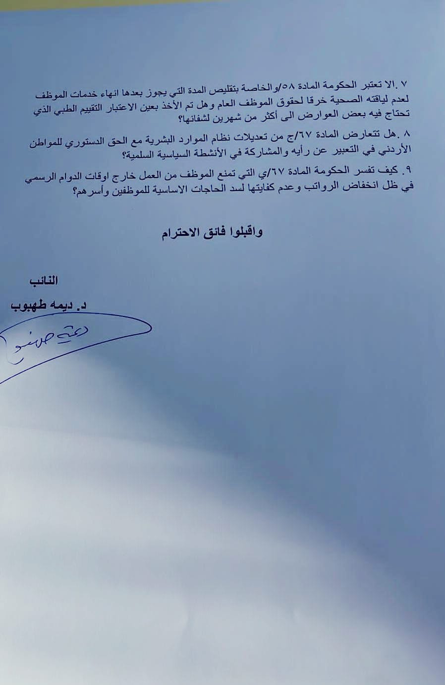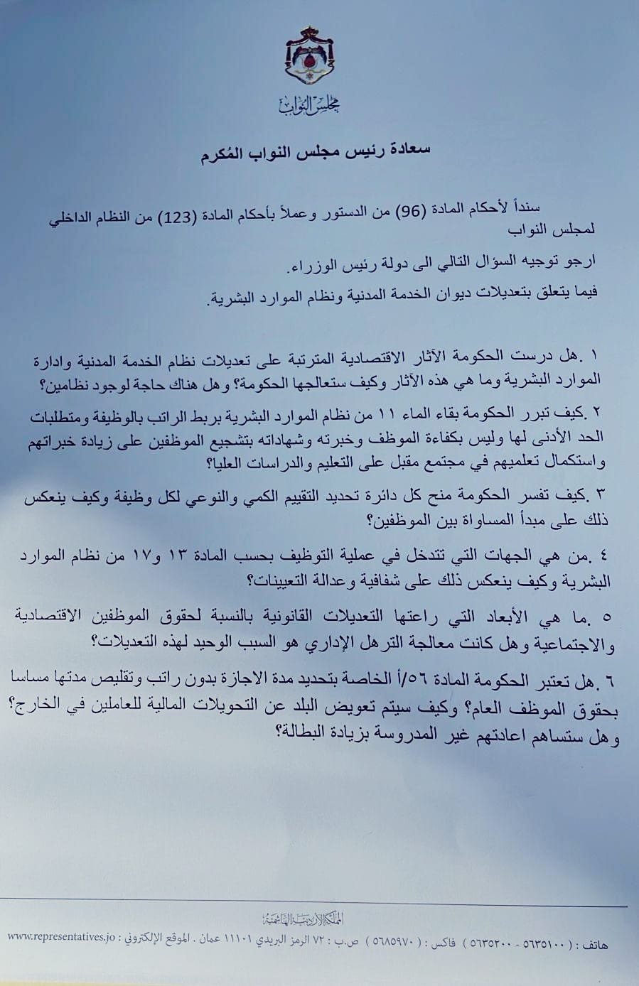 وجهت النائب د. ديما طهبوب سلسلة من الأسئلة للحكومة تتعلق بتعديلات ديوان الخدمة المدنية ونظام الموارد البشرية، متسائلة عن تأثيراتها الاقتصادية والاجتماعية، وحقوق الموظفين العامة، ومدى توافقها مع القوانين والدستور الأردني.