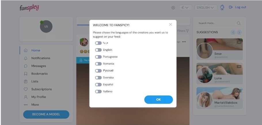 بعد التسجيل بنجاح، ستظهر لك رسالة منبثقة "مرحبًا بك في FanSpicy!". تتيح لك هذه الشاشة تخصيص لغات المبدعين الذين ترغب في رؤيتهم في موجزك. تُعد هذه الميزة طريقة رائعة لتخصيص تجربة التصفح الخاصة بك من خلال تخصيص موجزك للمحتوى الذي يتماشى مع تفضيلات اللغة الخاصة بك.