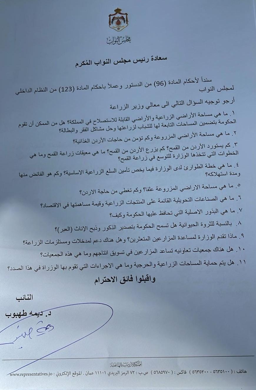 وتتضمن الأسئلة التي طرحتها النائبة طهبوب استفسارات بشأن مساحات الأراضي الزراعية القابلة للاستصلاح، ومدى مساهمة الزراعة في تأمين احتياجات الأردن الغذائية، بالإضافة إلى قضايا أخرى تتعلق بالزراعة والثروة الحيوانية، مثل استيراد القمح وتصدير الحيوانات كما تناولت الأسئلة دعم المزارعين، وخطط الوزارة للتعامل مع الطوارئ الزراعية.