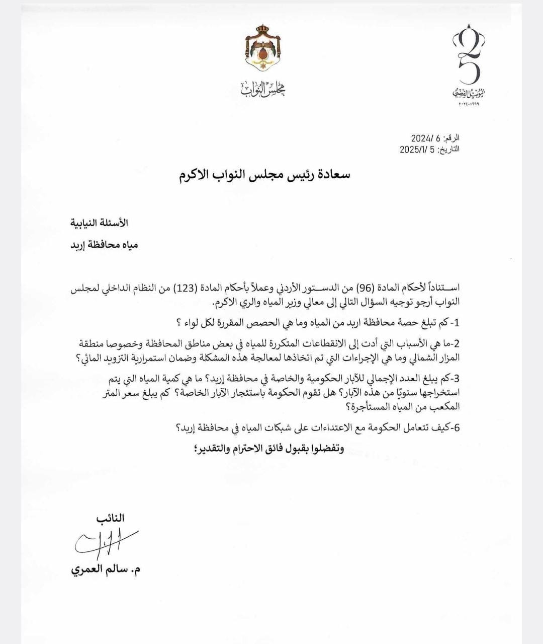 وطالب العمري بمعرفة كمية حصة محافظة اربد من المياه وما هي الحصص المقررة لكل لواء ؟ بالإضافة إلى الأسباب التي أدت إلى الانقطاعات المتكررة للمياه في بعض مناطق المحافظة وخصوصا منطقة المزار الشمالي إربد.