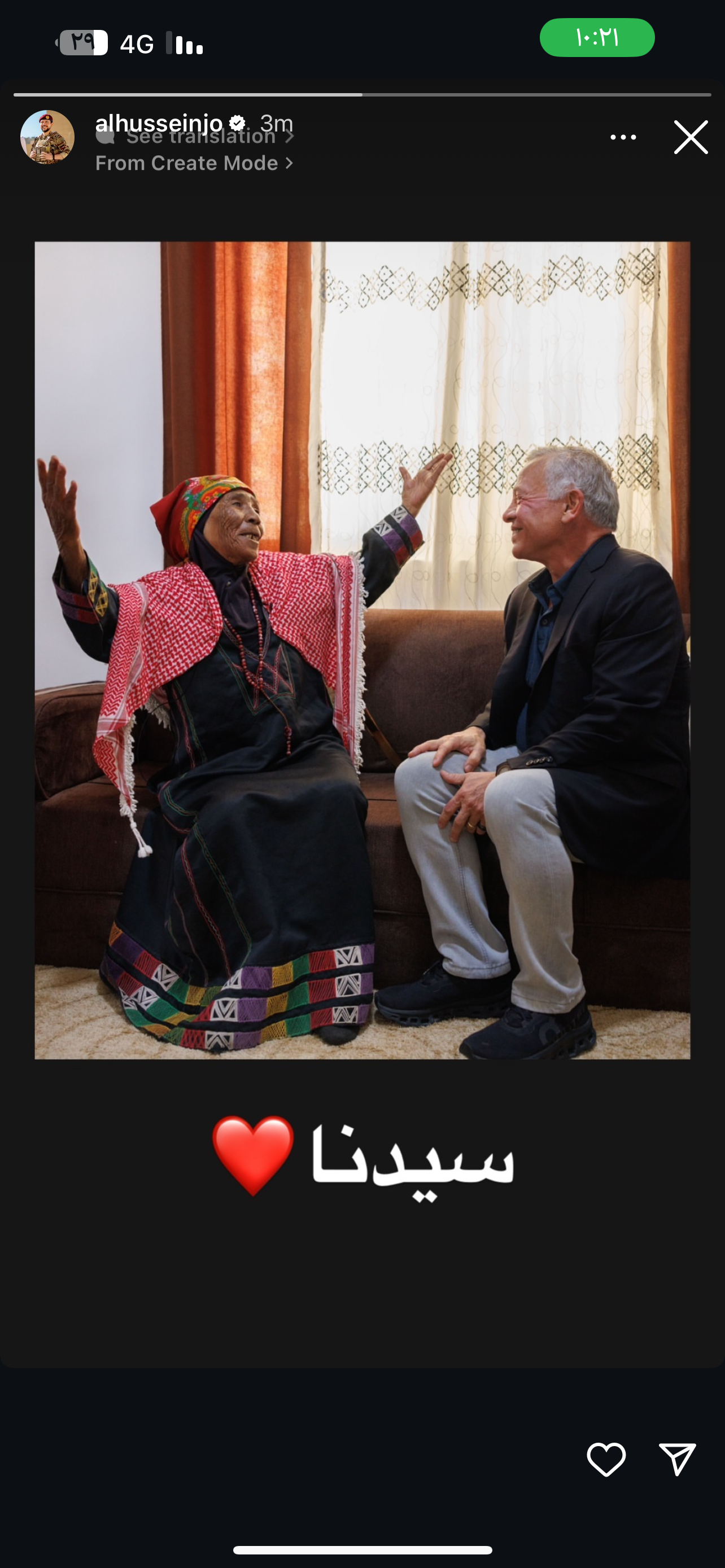 عمان جو- نشر سمو ولي العهد الأمير الحسين بن عبدلله الثاني عبر خاصية الستوري على إنستغرام صورة لجلالة الملك برفقة الحاجة فلحة معلقا عليها: "سيدنا".