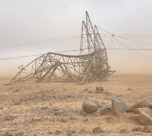 عمان جو- تسببت الرياح الشديدة في محافظة معان بسقوط عدد من أبراج الكهرباء الضغط العالي في منطقة الحسينية، اليوم الخميس.