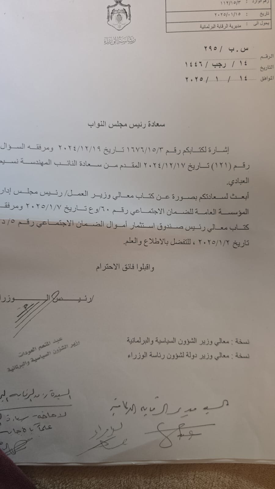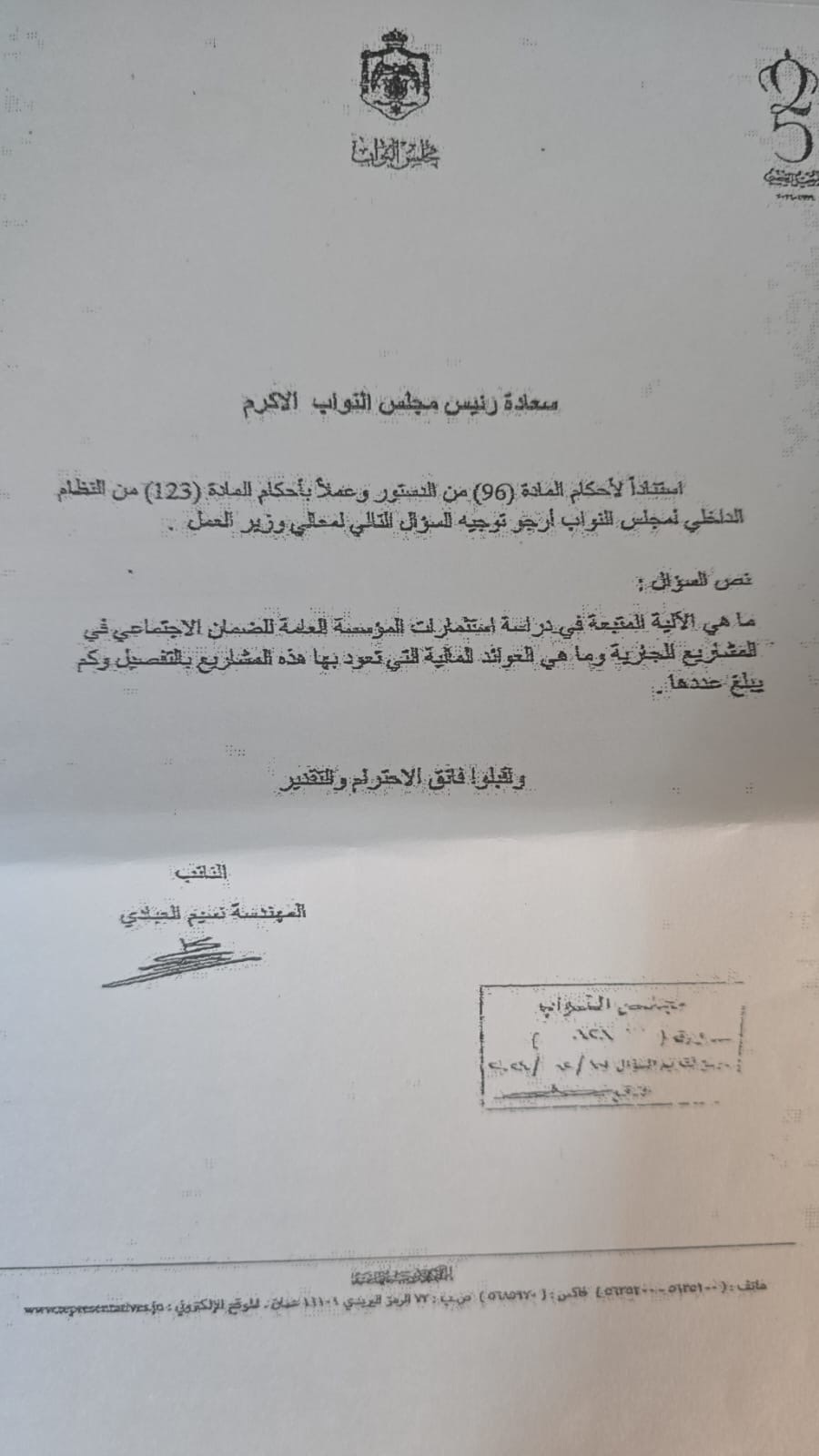 عمان جو- وجهت النائب المهندسة نسيم العبادي سؤالا نيابيا لوزير العمل / رئيس مجلس إدارة المؤسسة العامة للضمان الاجتماعي