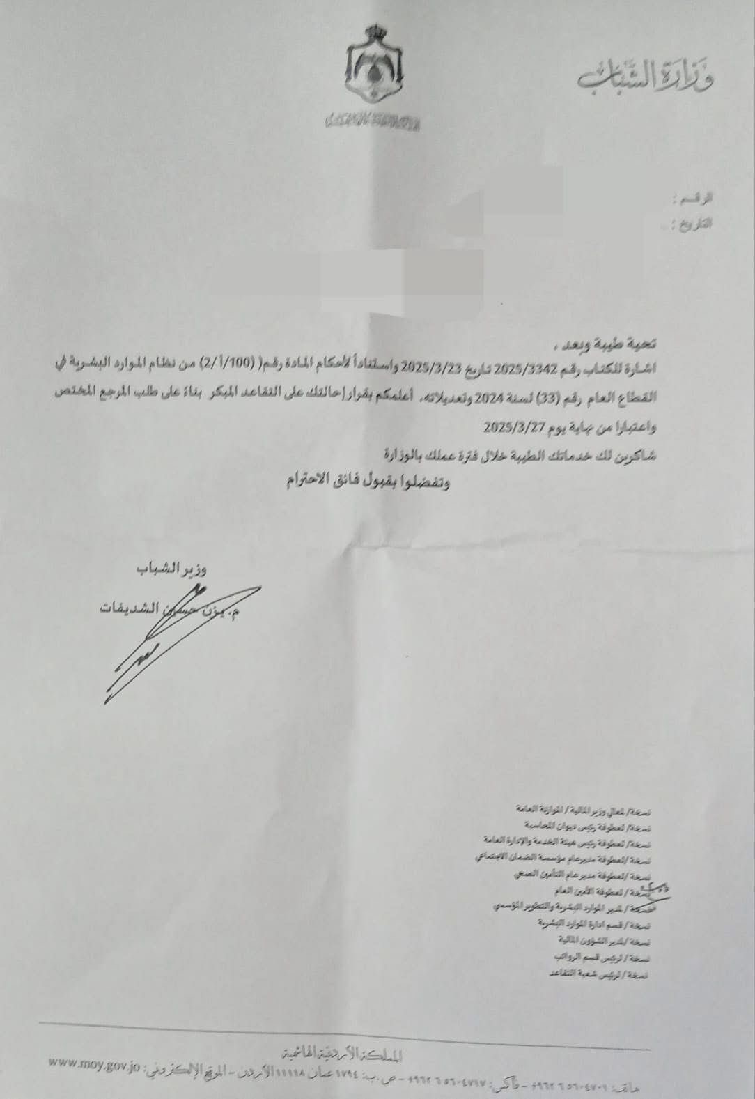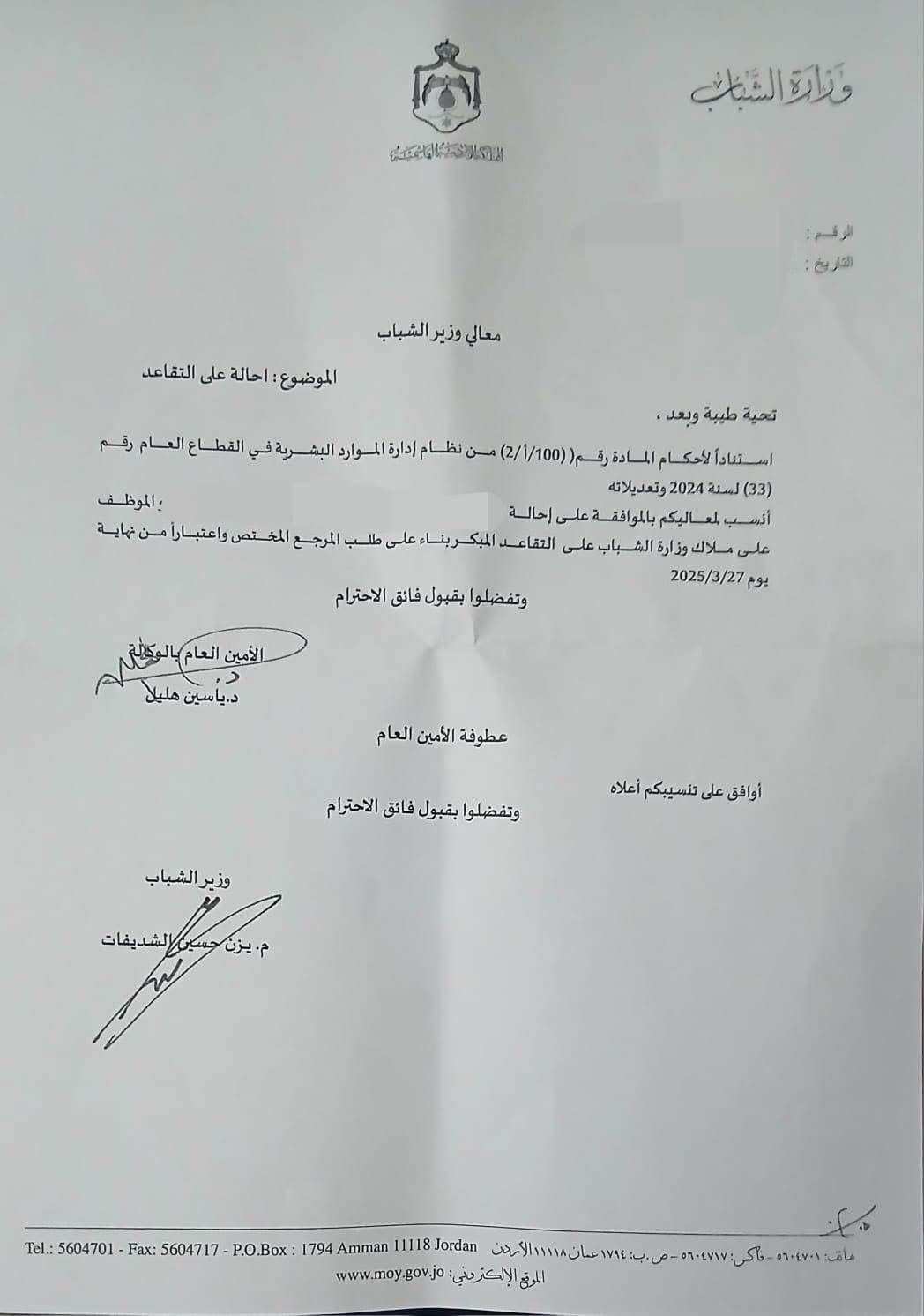 لنلاحظ كيف أن الكتاب المرفق يتضمن قراراً لوزير الشباب بإحالة أحد موظفي وزارة الشباب على التقاعد المبكر، وهو بالمناسبة أحد قيادات الوزارة. وهو قرار يتناقض مع قانون الضمان الاجتماعي أولاً، ثم مع نطام إدارة الموارد البشرية في القطاع العام.!