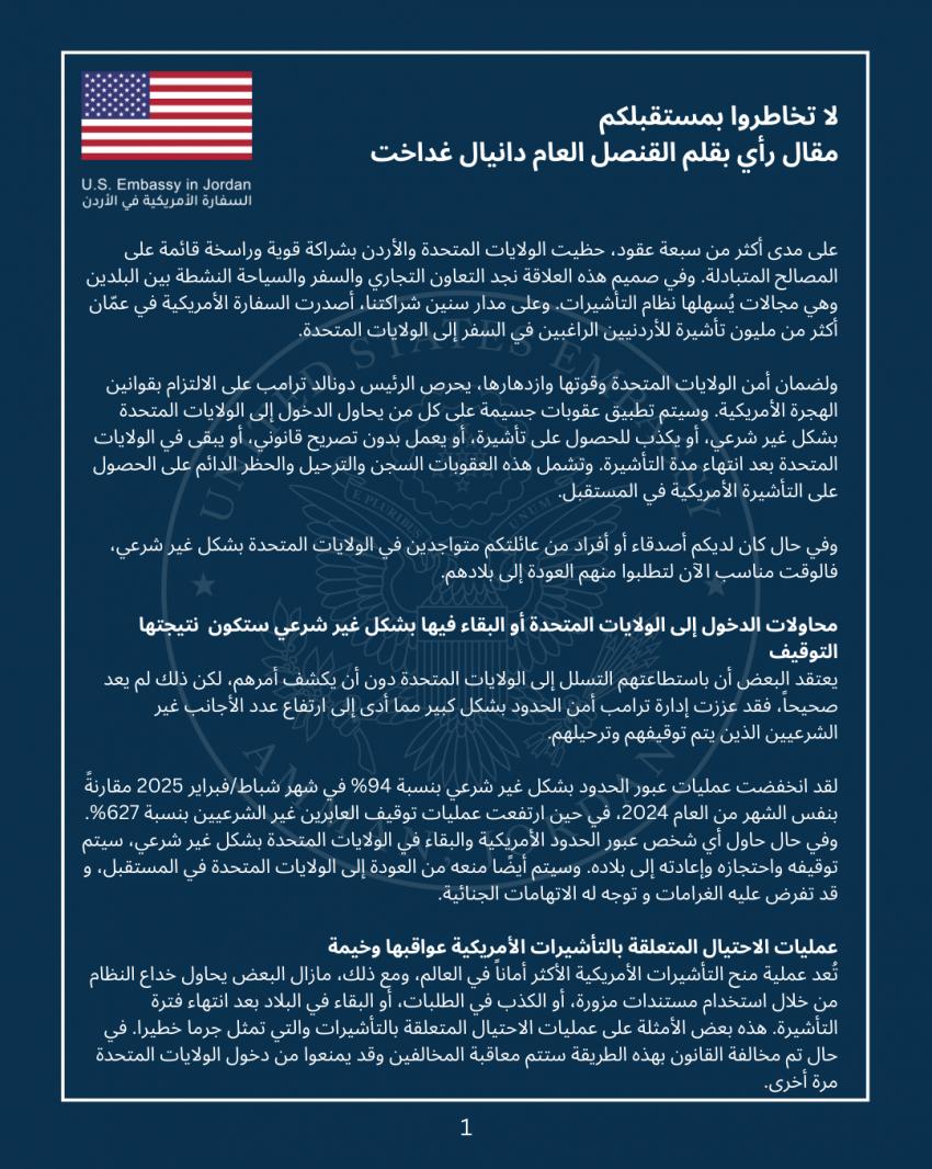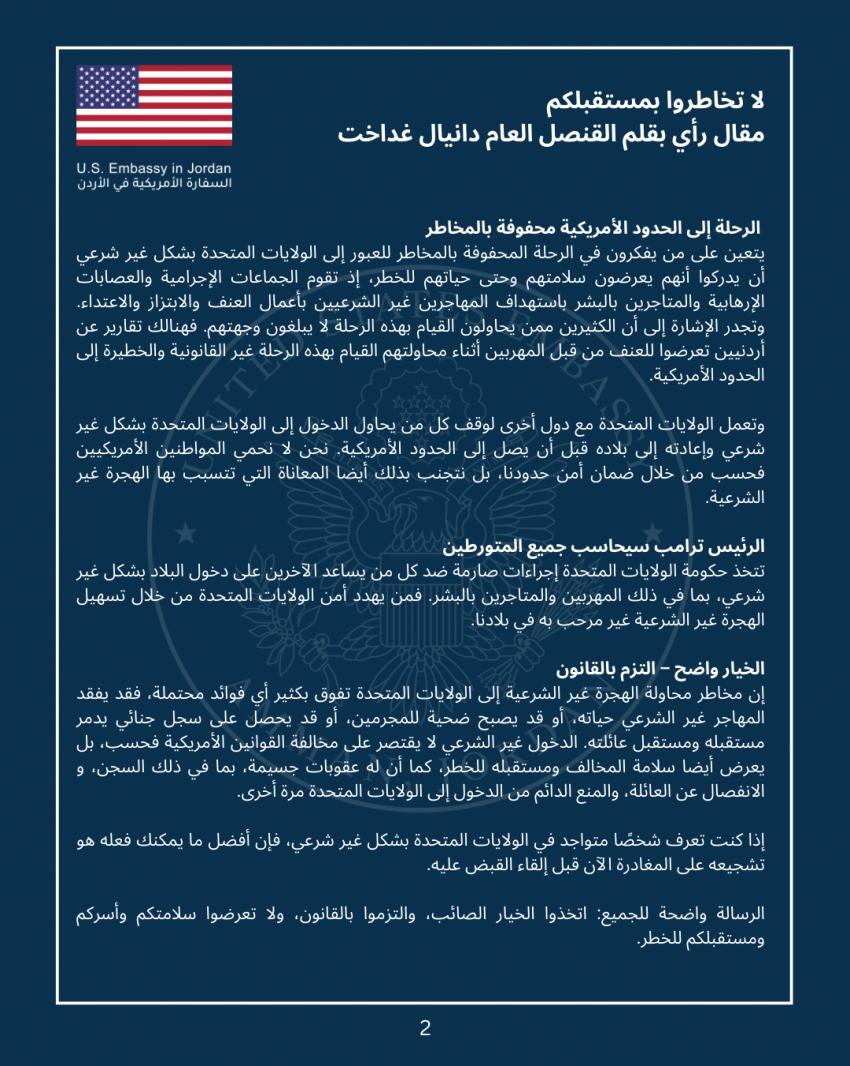 نشرت حسابات السفارة الأمريكية في الأردن اليوم السبت، مقالا للقنصل العام دانیال غداخت بعنوان "لا تخاطروا بمستقبلكم" يحذر فيه من محاولات الدخول إلى الولايات المتحدة أو البقاء فيها بشكل غير شرعي.