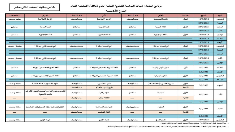 عمان جو- أعلنت وزارة التربية والتعليم الاثنين، عن جدول امتحانات شهادة الدراسة الثانوية العامة "التوجيهي" 2025 لطلبة الصف الثاني عشر.