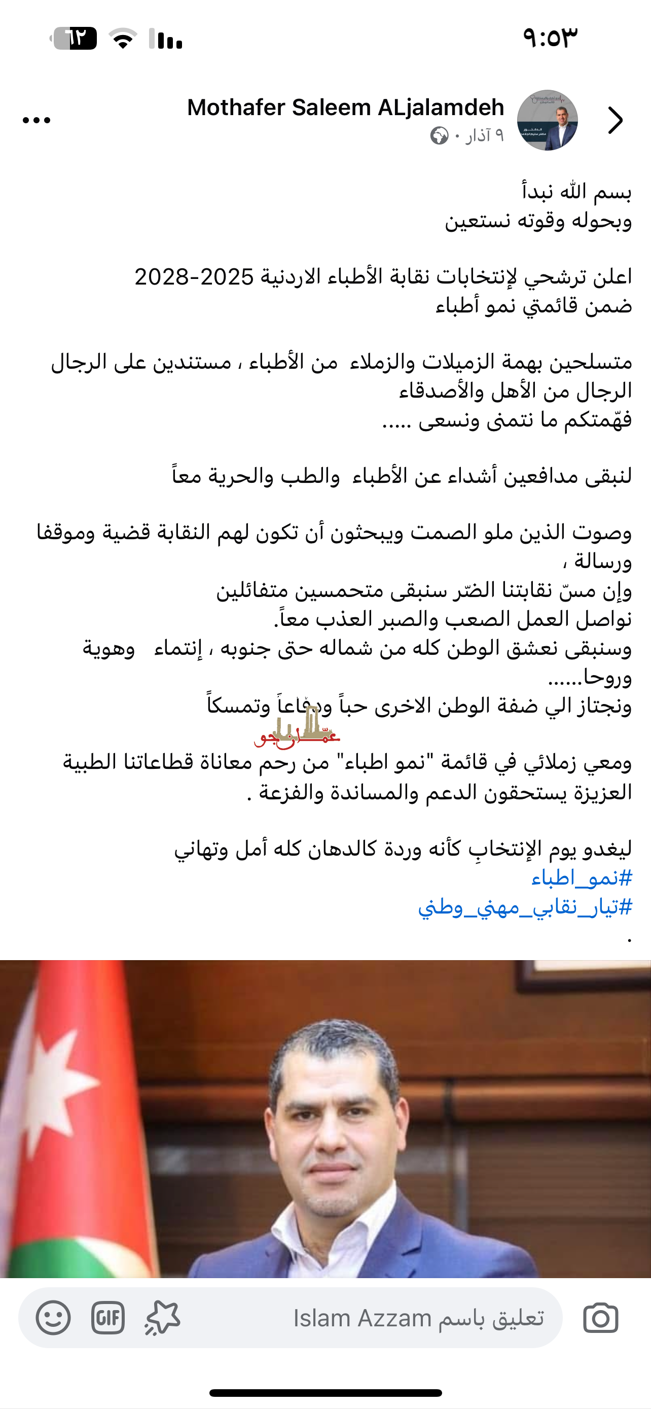 وبحوله وقوته نستعين اعلن ترشحي لإنتخابات نقابة الأطباء الاردنية 2025-2028 ضمن قائمتي نمو أطباء متسلحين بهمة الزميلات والزملاء من الأطباء ، مستندين على الرجال الرجال من الأهل والأصدقاء فهّمتكم ما نتمنى ونسعى .