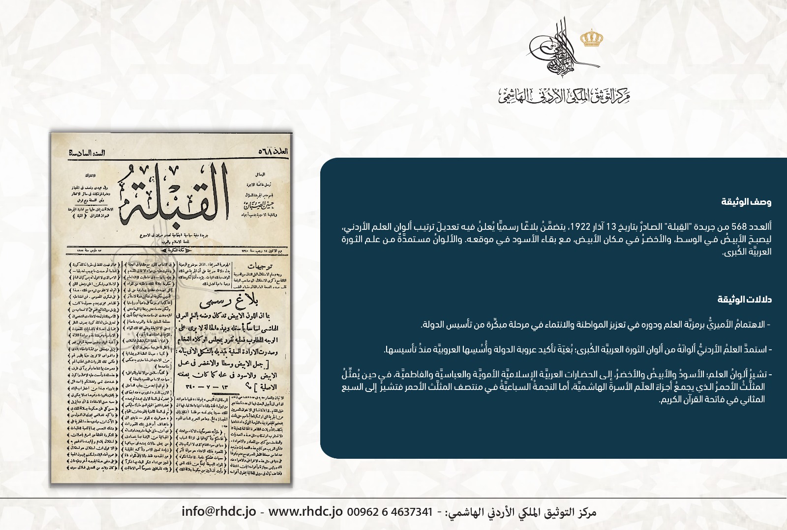 عمان جو- عرض مركز التوثيق الملكي الأردني الهاشمي بمناسبة ذكرى يوم العلم الأردني، الذي يصادف السادس عشر من نيسان وثيقة من أرشيفه تظهر العدد 568 من جريدة "القبلة" الصادرة بتاريخ 13 آذار 1922.