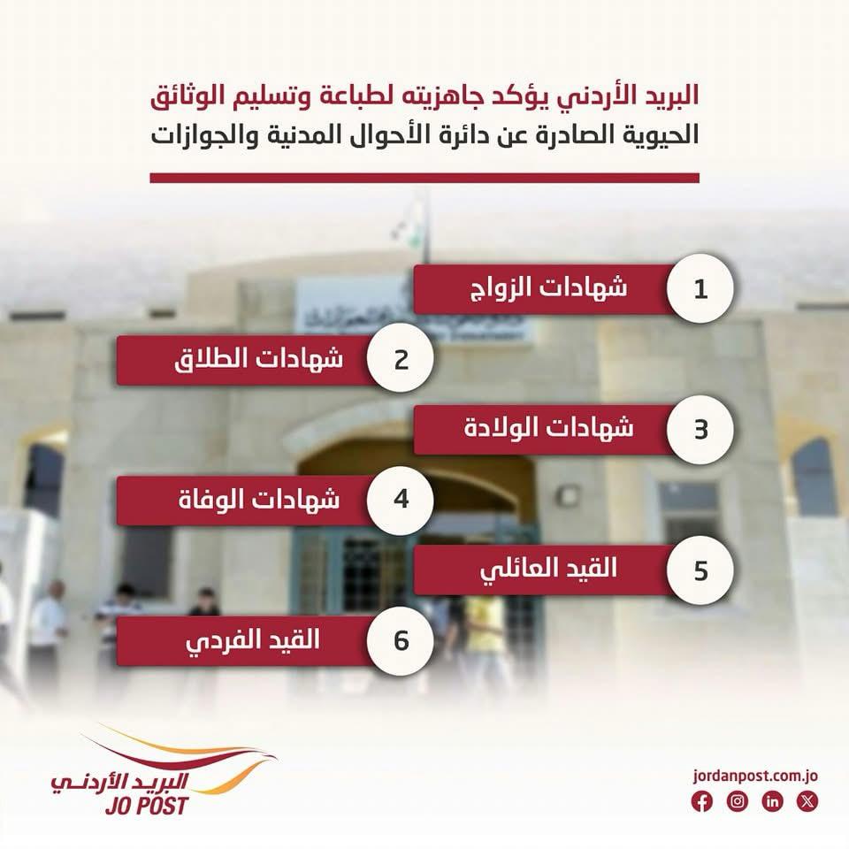 فإن البريد الأردني يؤكد تقديم هذه الخدمات نيابة عن المواطن من خلال مكاتبه المنتشرة في كافة أنحاء المملكة من خلال استصدار وطباعة الشهادات الحيوية من خلال فروعه المنتشرة أو طلب توصيلها واستلامها بمكان الإقامة من خلال تطبيق سند.