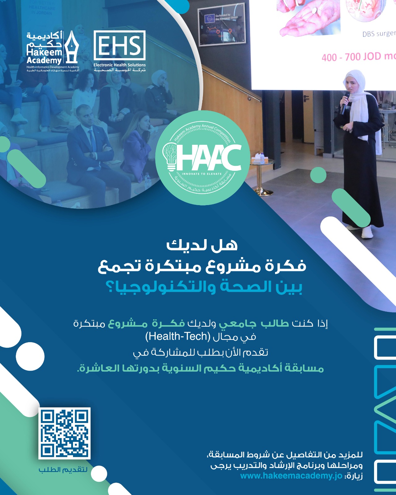عمان جو - أعلنت أكاديمية حكيم، إحدى برامج شركة الحوسبة الصحية، عن فتح باب التسجيل في النسخة العاشرة من مسابقة أكاديمية حكيم السنوية التي تستهدف طلبة الجامعات الأردنية من مختلف التخصصات الطبية والهندسية والتكنولوجية.