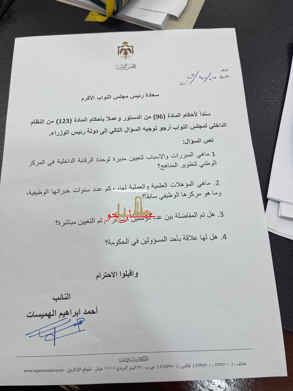 عمان جو- وجه النائب الثاني لرئيس مجلس النواب أحمد الهميسات سؤالاً نيابياً لدولة رئيس الوزراء جعفر حسان حول إحدى تعيينات المدراء في المركز الوطني لتطوير المناهج.