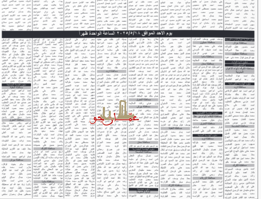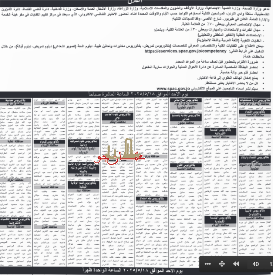 عمان جو- - دعت وزارة الصحة ووزارة التنمية الاجتماعية ووزارة الاوقاف والشؤون والمقدسات الاسلامية ووزارة الزراعة ووزارة الاشغال والاسكان ووزارة الداخلية ودائرة الشؤون الفلسطينية وسطة وادي الاردن المرشحون التالية اسماؤهم التواجد حسب الايام والاوقات المحددة ادناه، لحضور الاختبار التنافسي الالكتروني.