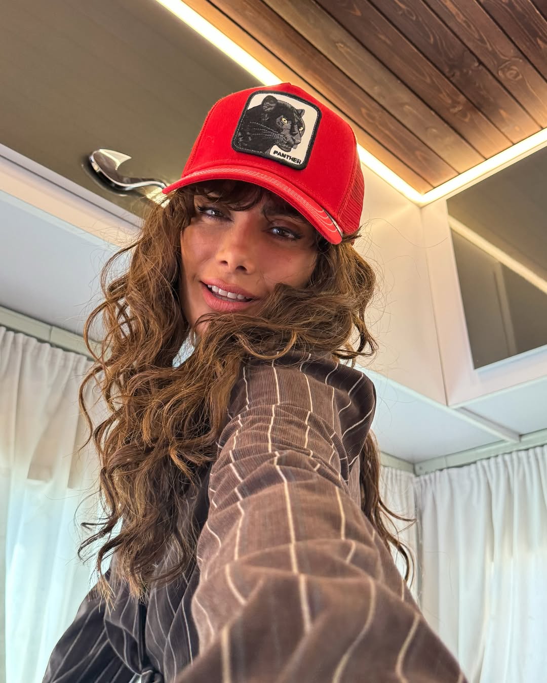 ظهرت صبا ببنطال جينز كلاسيكي وقميص بني مخطط بالبيج، ربطته من المنتصف ليكشف عن جزء من بطنها، وأكملت اللوك بقبعة حمراء ناعمة.
