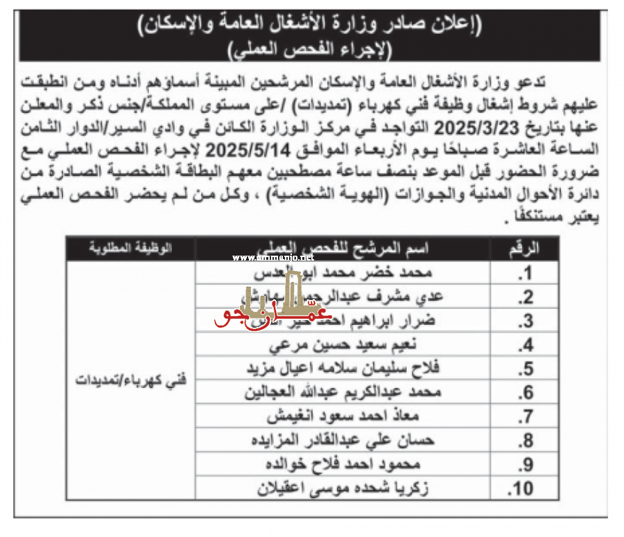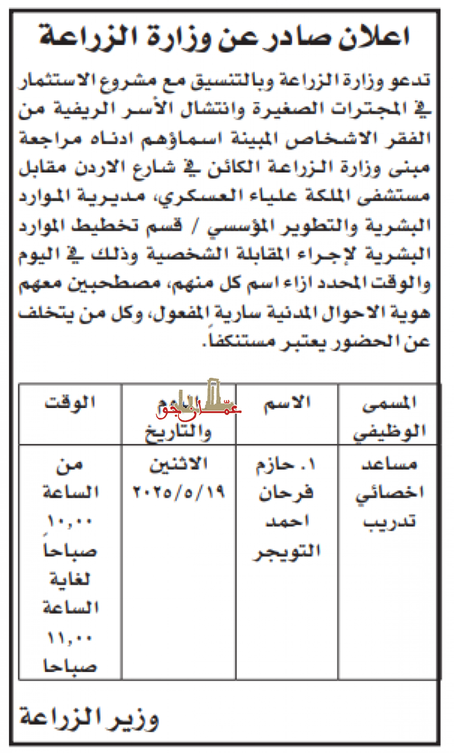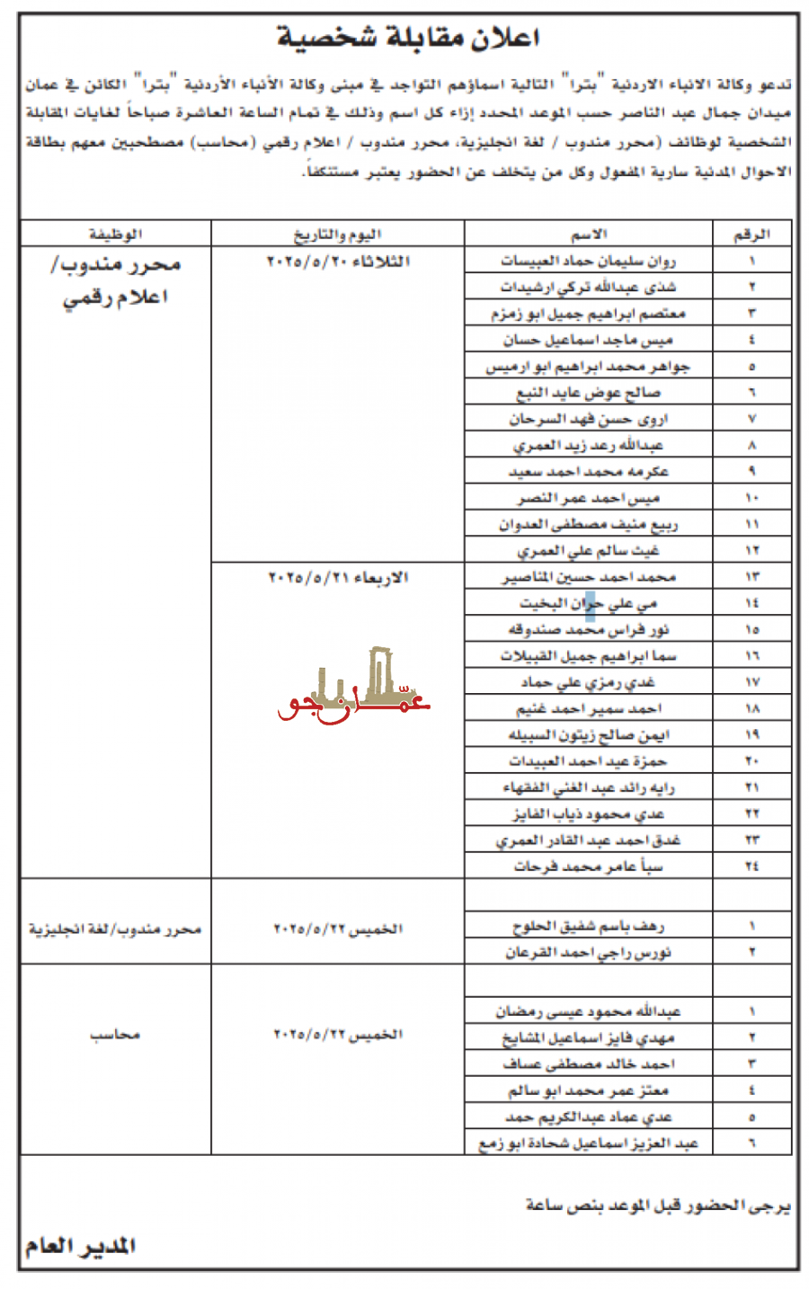 عمان جو- أعلنت عدد من المؤسسات الرسمية، اليوم الثلاثاء، عن حاجتها لتعبئة وظائف شاغرة، فيما دعت أخرى عددًا من المرشحين لإجراء المقابلات الشخصية.