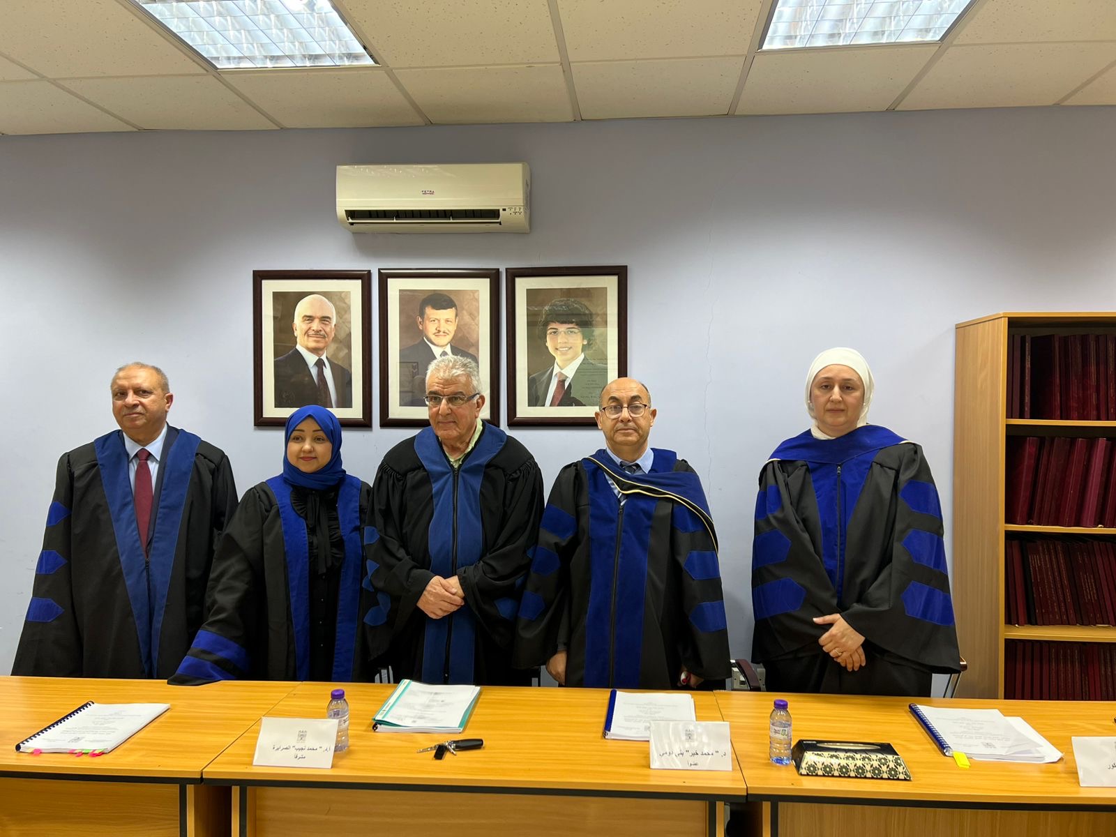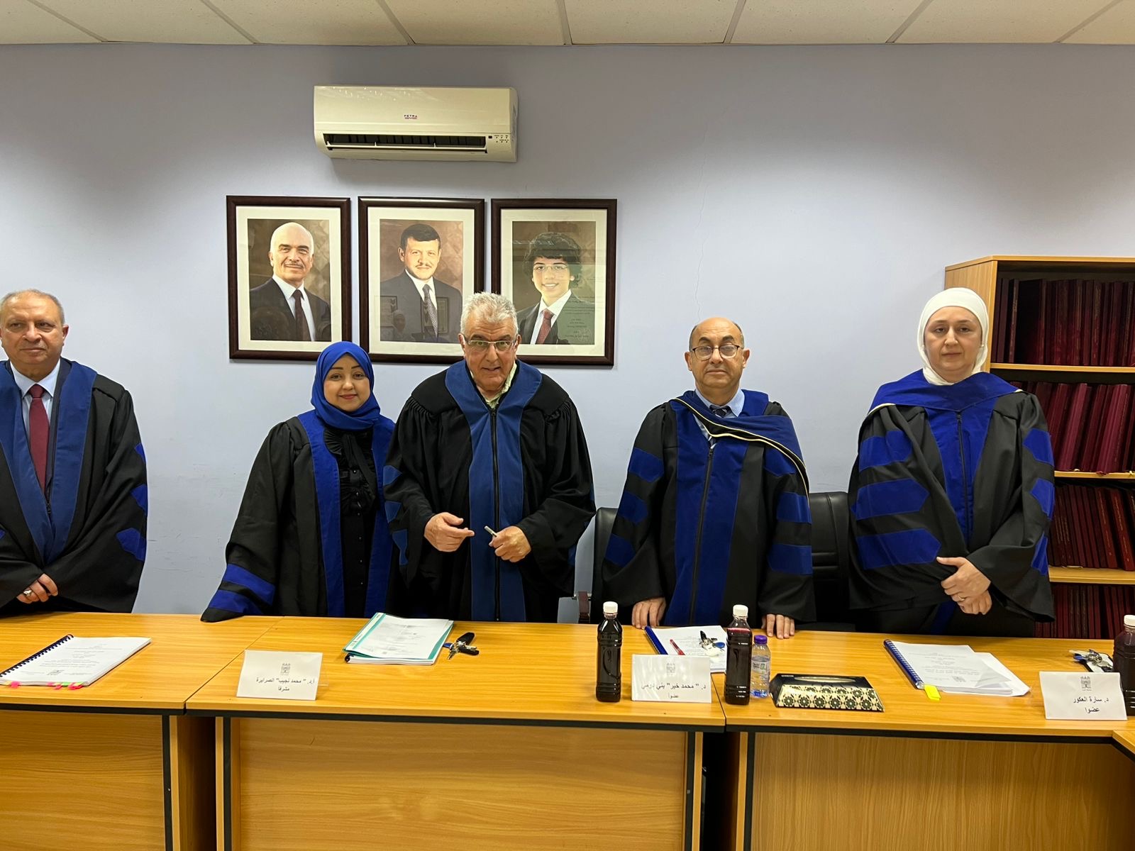 تألفت لجنة المناقشة من الأستاذ الدكتور محمد نجيب الصرايرة مشرفًا ورئيسًا، والأستاذ الدكتور كامل أخو ارشيد مناقشًا خارجياً ، والدكتورة سارة العكور مناقشًا داخليًّا، بالإضافة إلى الدكتور محمد بني دومي مناقشًا داخليا. وقد أشادت اللجنة بالمنهجية العلمية التي اعتمدها الباحث وبالمعلومات التي قدمها في دراسته.