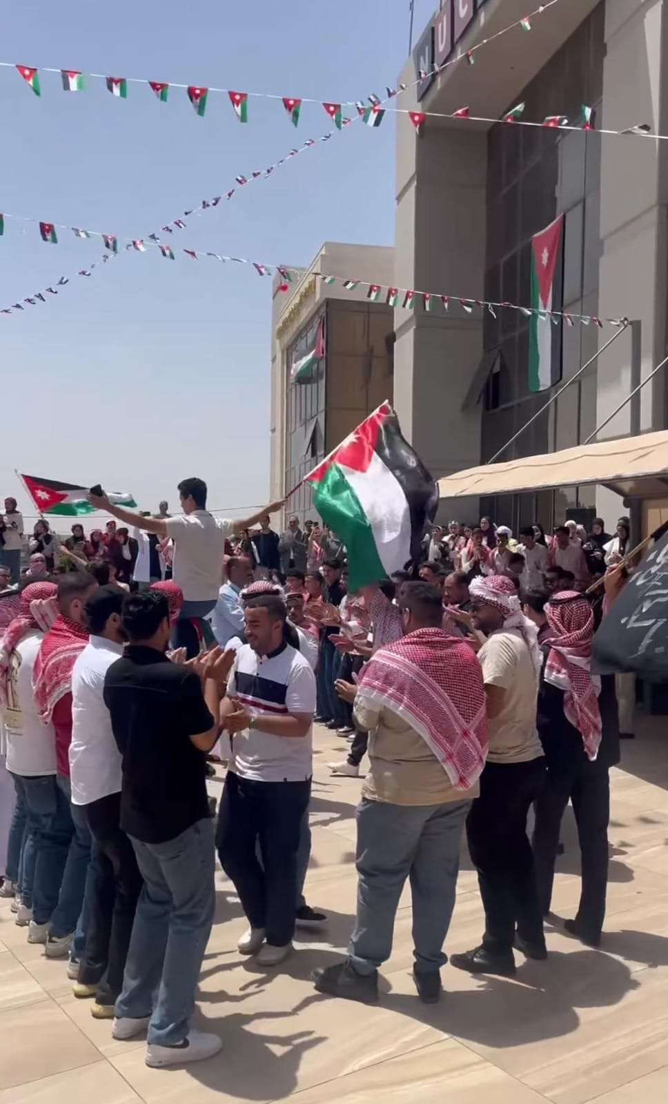عمان جو- في اجواء مفعمة بالولاء والانتماء والفخار والاعتزاز رفع المشاركون في احتفالات الكلية الجامعية الوطنبة للتكنولوجيا في ابو علندا بعيد الاستقلال 79 ، برقية تهنئة وتبريك الى مقام صاحب الجلالة الهاشمية الملك عبد الله الثاني ابن الحسين ، وولي العهد صاحب السمو الملكي الامير الحسين ابن عبد الله الثاني ، الذي اقامته الكلية برعاية متصر لواء القويسمة الدكتور اسامة الهاشم ، الدكتور ايمن مقابلة عميد الكلية في حرم الكلية .