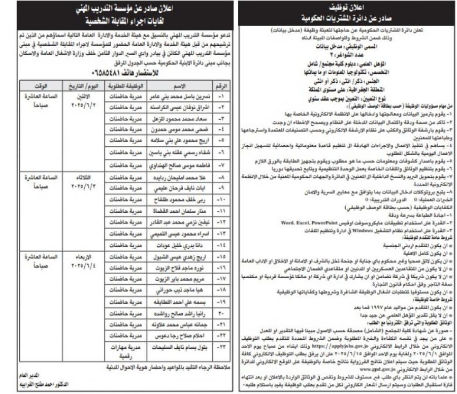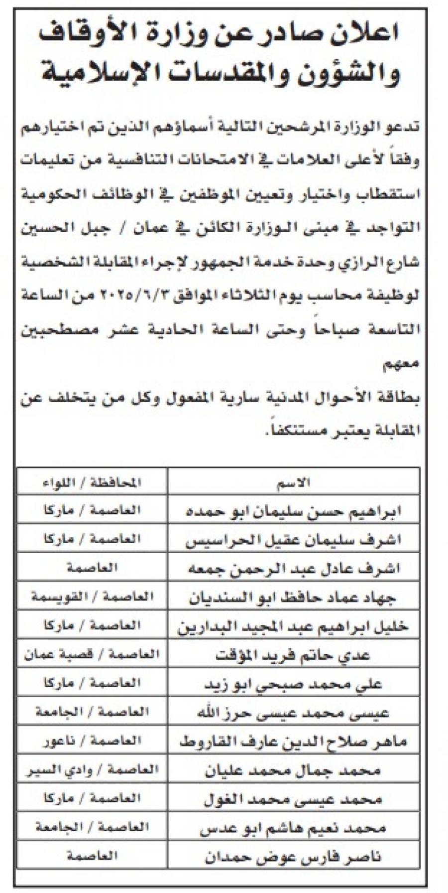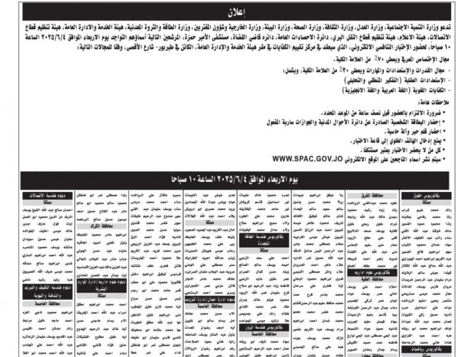 كما دعت مؤسسات أخرى التالية أسماؤهم لحضور الاختبار التنافسي الإلكتروني يوم الأربعاء الموافق 4-6-2025 الساعة 10 صباحا في مركز تقييم الكفايات في مقر هيئة الخدمة والإدارة العامة الكائن في طبربور - شارع الأقصى وفقا للمجالات التالية: