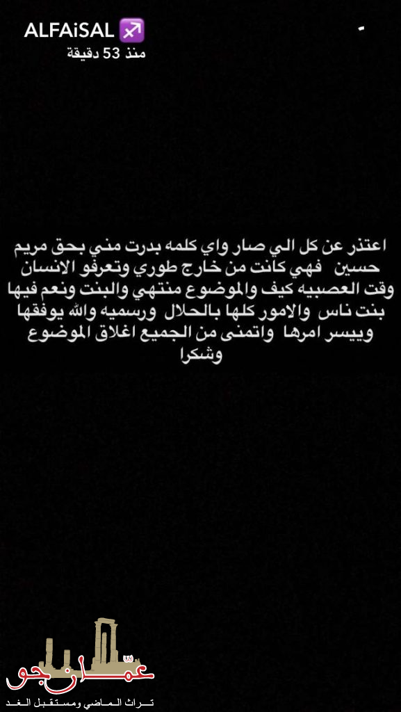 وقدّم الفيصل اعتذاره عبر حساباته على شبكات التواصل الاجتماعي، مؤكداً أن الكلام الذي صدر عنه بحق مريم حسين لم يكن مقصوداً إذ كان خارجاً عن طوره وفق ما هو مبين في الصورة اعلاه.