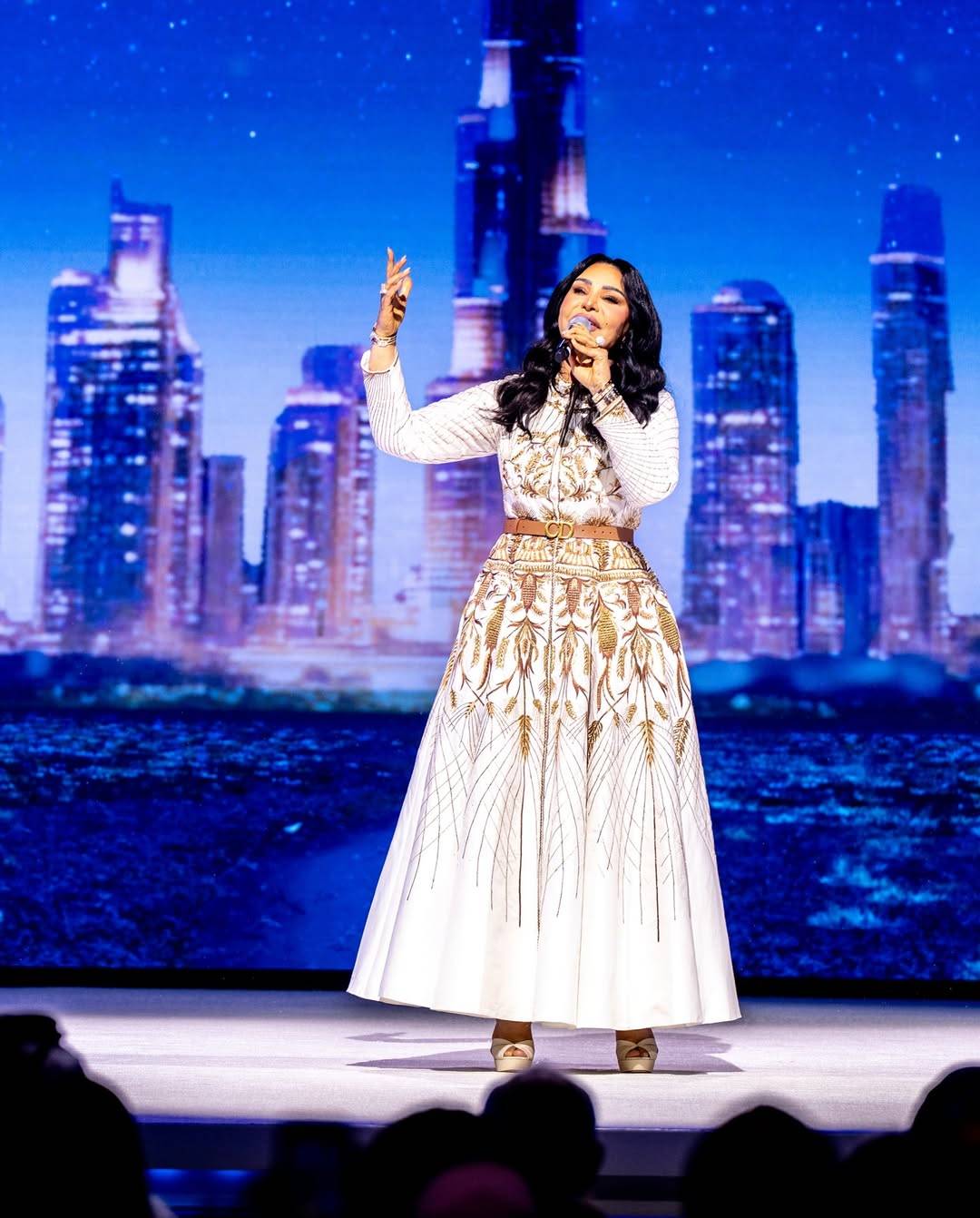 عمان جو - اختارت النجمة أحلام فستاناً ناعماً بتفاصيل شرقية رقيقة خلال مشاركتها في منتدى الإعلام العربي في دبي، حيث قدّمت أشهر أغانيها وأشعار سمو الشيخ محمد بن راشد آل مكتوم.