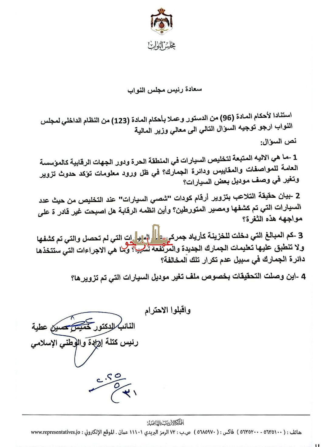 عمان جو- تقدم النائب الدكتور خميس عطية رئيس كتلة إرادة والوطني الإسلامي النيابية بسؤالاً نيابياً إلى وزير المالية عبدالحكيم الشبلي، عن الآلية المتبعة لتخليص السيارات في المنطقة الحرة خصوصاً بعد ورود معلومات إليه تؤكد حدوث عمليات تزوير وتغيير في وصف موديلات عدد من المركبات، وعن المبالغ الواردة إلى خزينة الدولة من الإيرادات الجمركية.