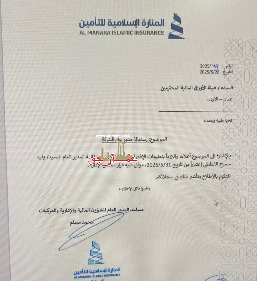 عمان جو– أعلنت شركة المنارة الإسلامية للتأمين عن استقالة مديرها العام السيد وليد سميح القطب، وذلك اعتبارًا من يوم السبت الموافق 31 أيار 2025، بناءً على قرار صادر عن مجلس إدارة الشركة.