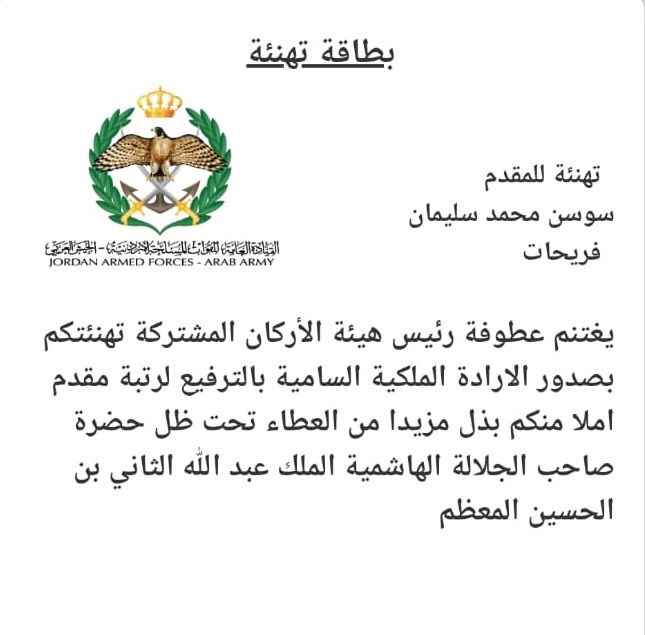 عمان جو- يتقدم المقدم الركن محمد عقله ابو عابد وأبناءه( ريناد ونور وعبدالله وسند ) بأحر التهاني والتبريكات إلى الزوجه الغاليه ؛ والأم الحنونه ( ام عبدالله ) بمناسبة ترفيعها إلى رتبة مقدم الف مبارك ومنها للأعلى يارب