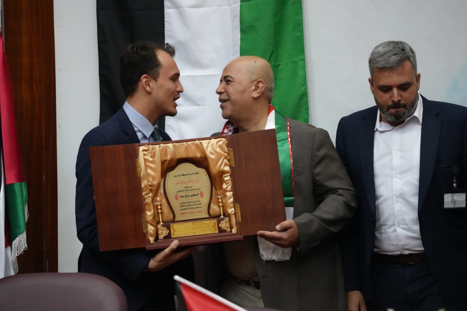 أما المهندس ليث البكار، مؤسس شركة "يدا بيد"، فقد عبّر بكلمته عن اعتزازه العميق بجلالة الملك وولي العهد، وبارك تأهل المنتخب الوطني، واصفًا الحدث بأنه "نقطة ضوء جديدة في مسيرة الوطن". كما قدّم درع تكريم إلى مدير المستشفى، معربًا عن فخره بالكوادر الطبية والإدارية التي وصفها بـ"درع الوطن الصامت".