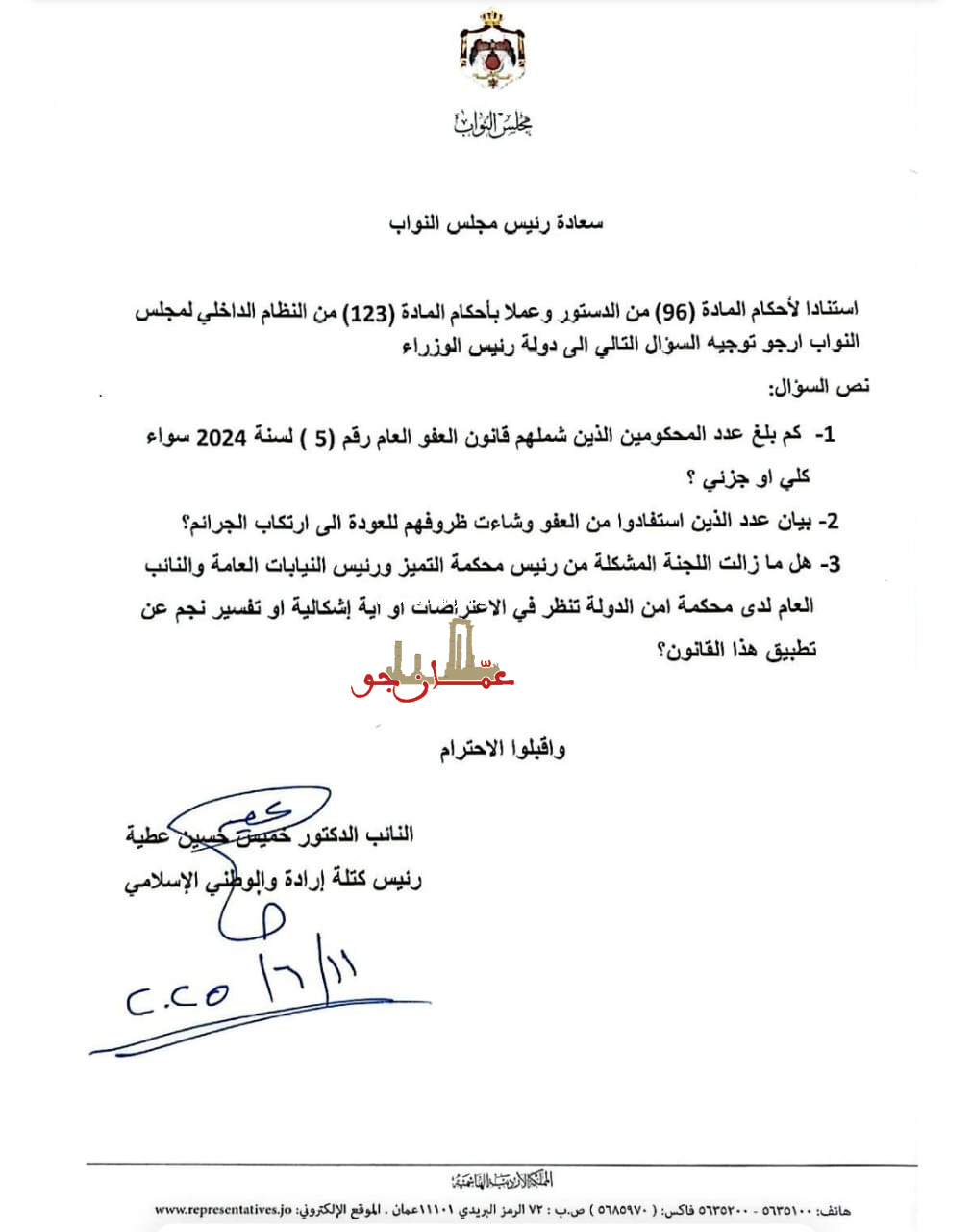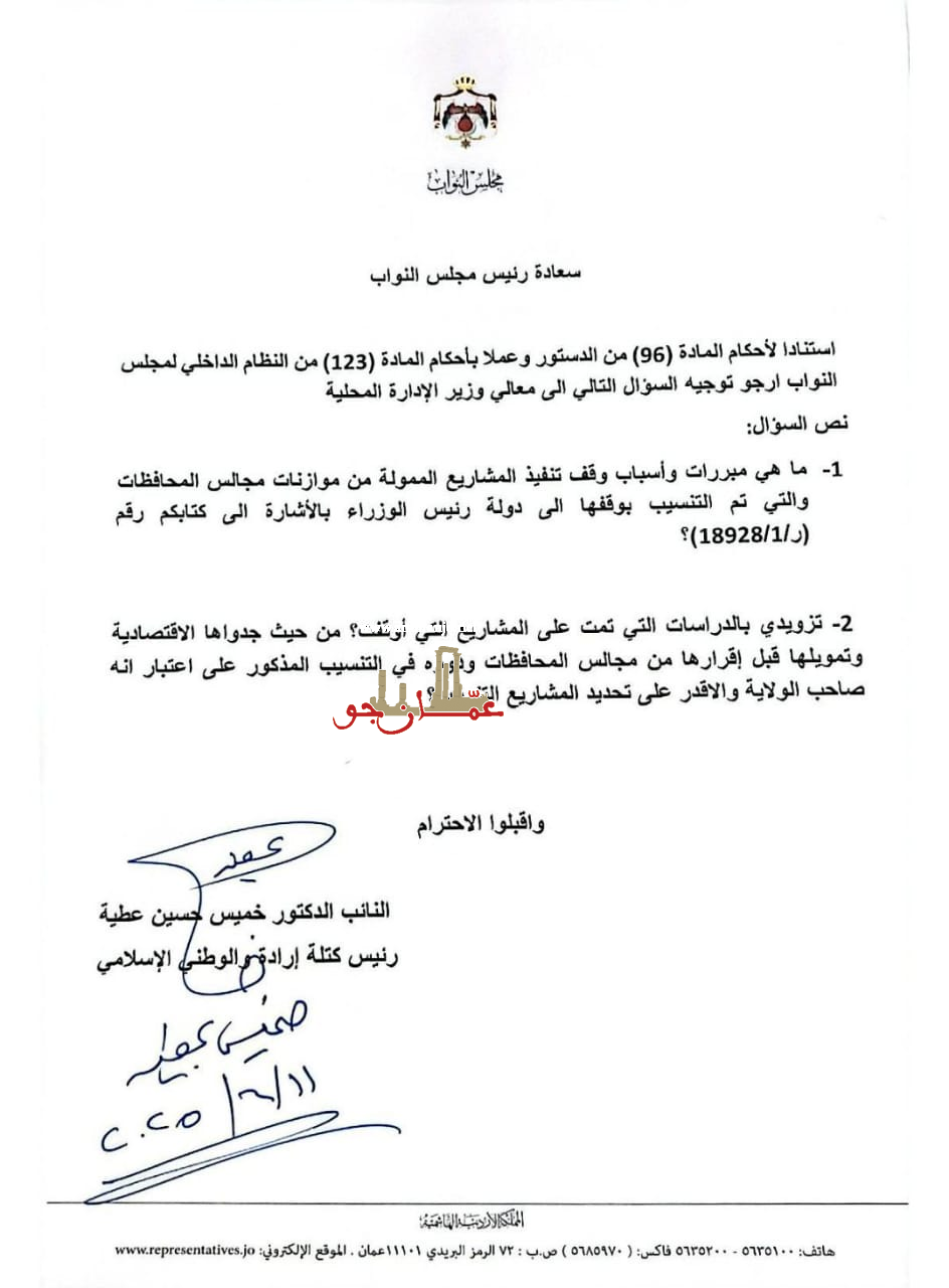 عمان جو- وجه النائب الدكتور خميس عطية، رئيس كتلة إرادة والوطني الإسلامي النيابية بسؤالين إحداها لدولة رئيس الوزراء جعفر حسان والآخر لمعالي وزير الإدارة المحلية وليد المصري، وجاءت تلك الأسئلة بالترتيب لدولة رئيس الوزراء عن عدد المحكومين الذين شملهم العفو العام لسنه 2024 وبيان عدد الذين استفادوا من العفو، فيما كان نصيب معالي وليد المصري من الأسئلة عن مبررات وأسباب وقف تنفيذ المشاريع المعمولة من موازنات مجالس المحافظات، وتزويده بالدراسات التي تمت على المشاريع التي أوقفت