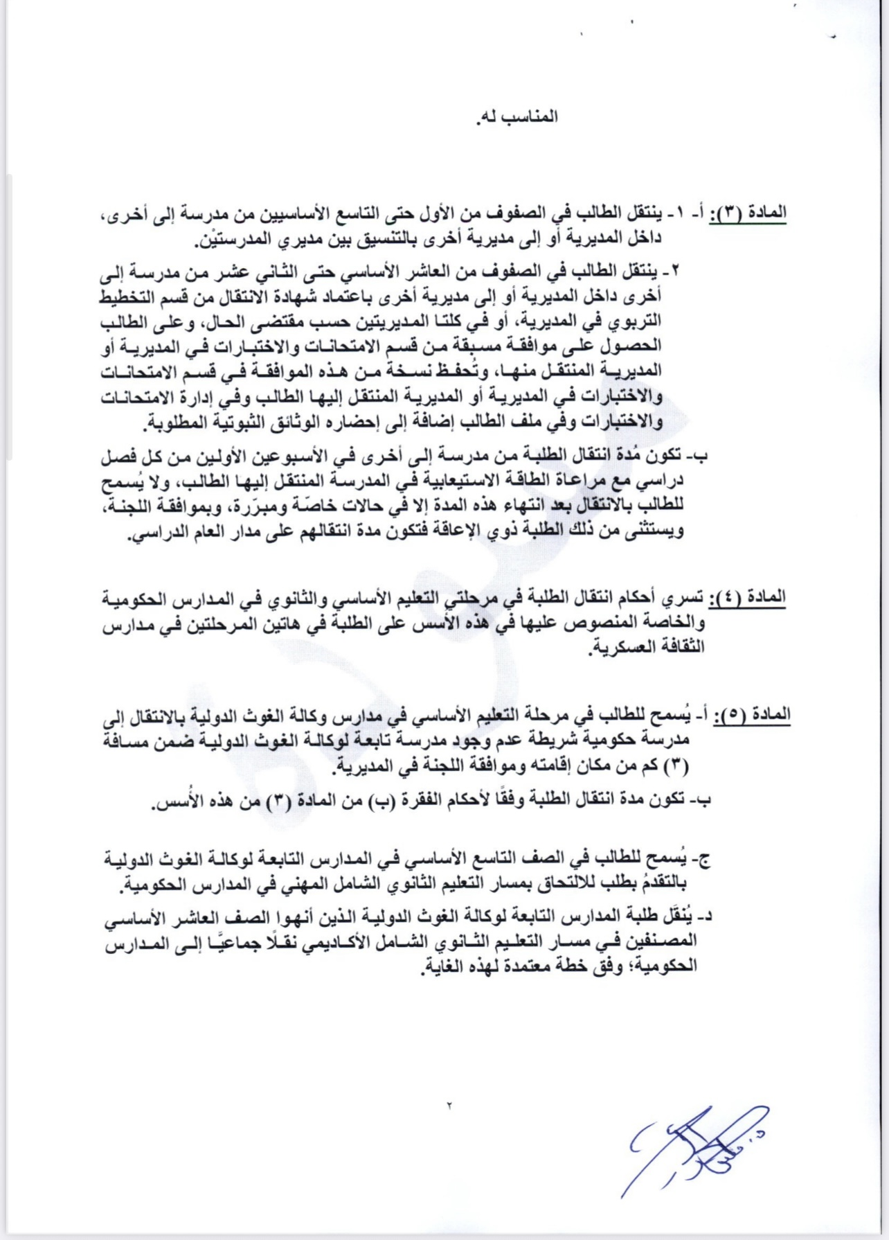 سمحت التعليمات بانتقال الطلبة من الصف الأول وحتى التاسع الأساسي من مدرسة إلى أخرى داخل المديرية أو إلى مديرية أخرى، شريطة التنسيق بين مديري المدرستين، وأن يتم النقل خلال أول أسبوعين من الفصل الدراسي الأول، مع إمكانية الاستثناء بموافقة اللجنة المختصة.