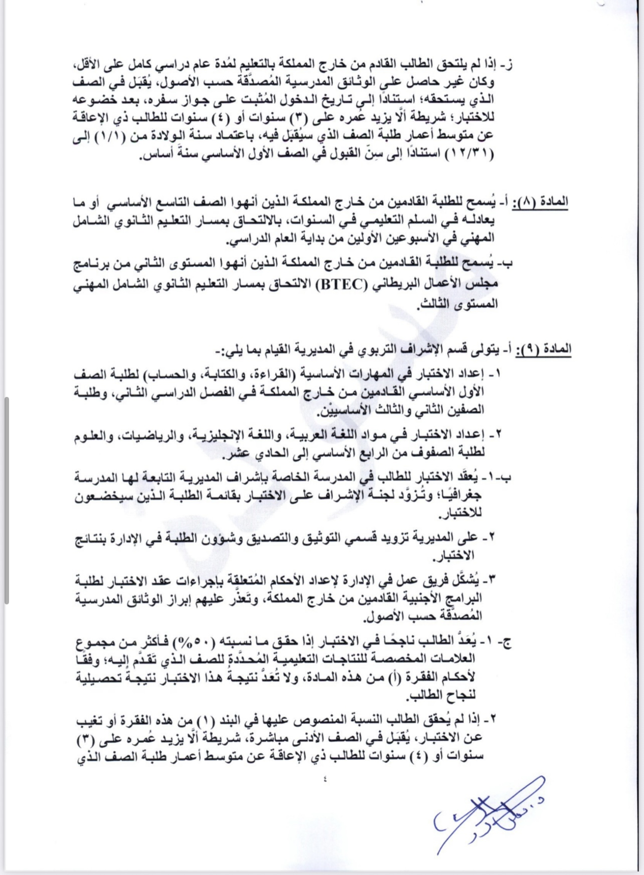 أُتيح للطلبة القادمين من الخارج والملتحقين ببرامج دولية مثل برنامج الأعمال البريطاني (BTEC) الانتقال إلى التعليم الثانوي الشامل في مستواه الثاني والثالث ضمن شروط محددة تتعلق بمعادلة الشهادات والوثائق الدراسية المصدقة.