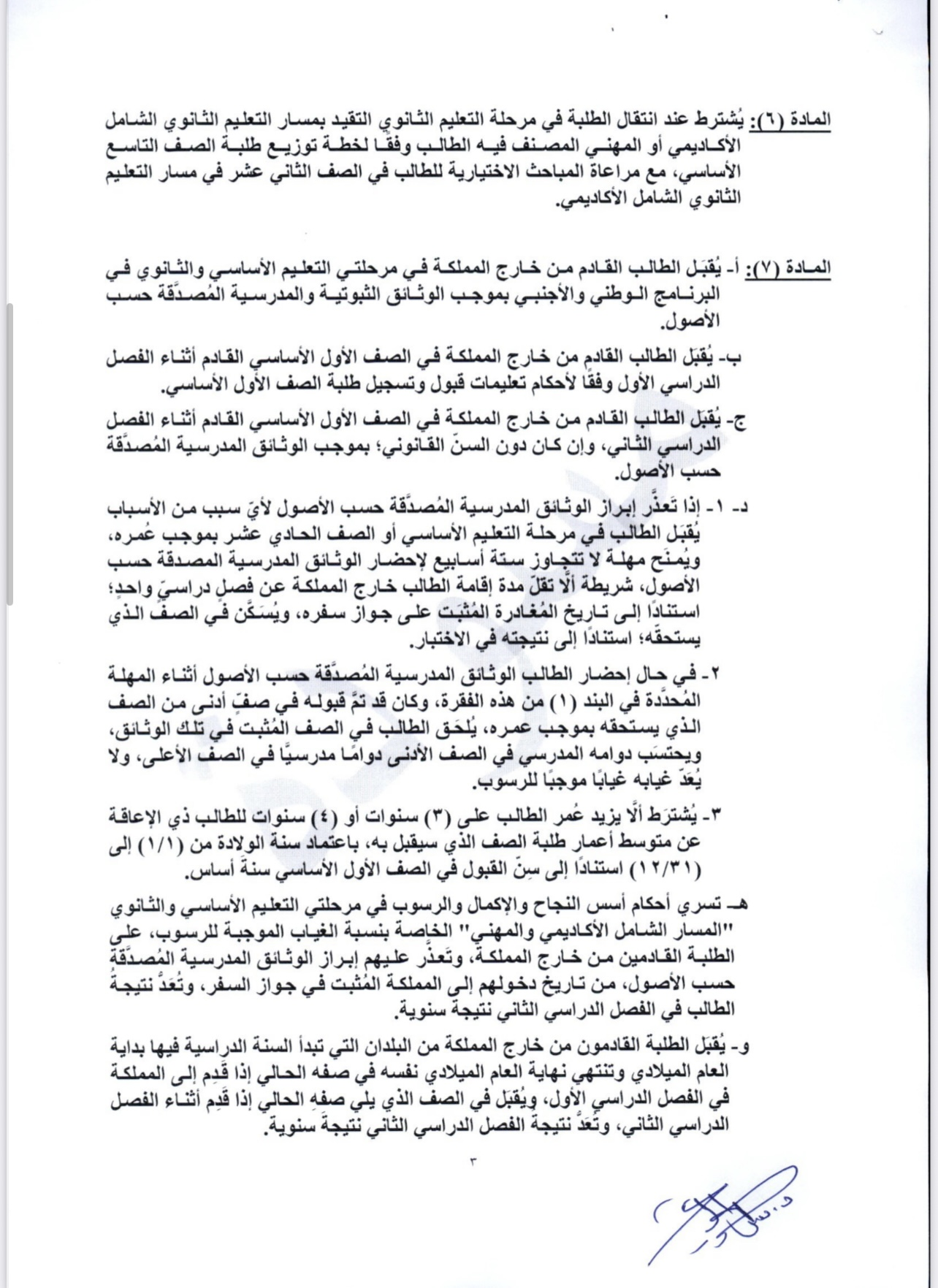أُتيح للطلبة القادمين من الخارج الالتحاق بالصفوف المناسبة حسب وثائقهم الدراسية المصدقة، وفي حال عدم اكتمال الوثائق يخضع الطالب لاختبار تحديد مستوى لتسكينه في الصف المناسب. كما شملت التعليمات الطلبة القادمين من أنظمة تعليمية غير أردنية بإجراءات تضمن العدالة وتقييم المستوى الفعلي للطالب.