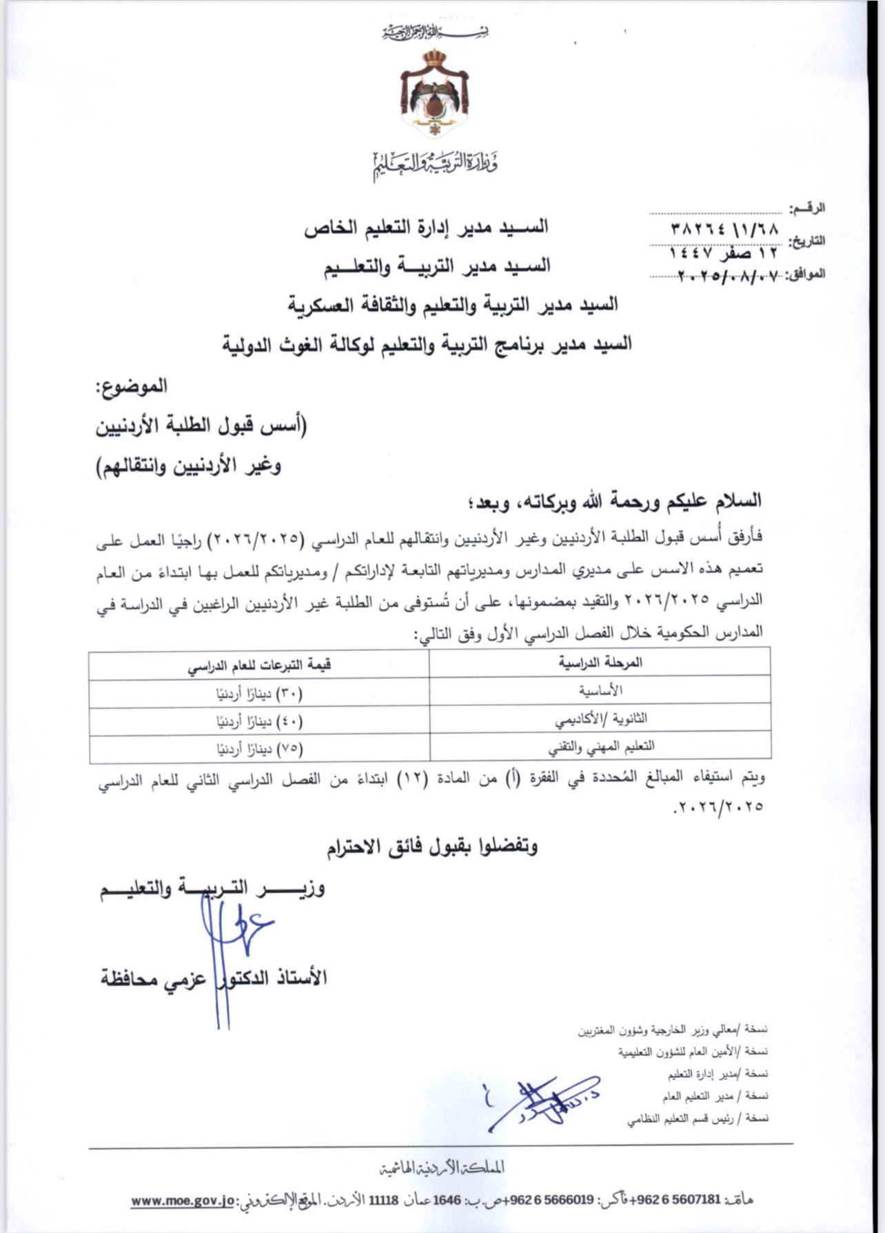 أعلنت وزارة التربية والتعليم عن صدور تعليمات جديدة للقبول والانتقال في المدارس الحكومية والخاصة للعام الدراسي 2025-2026 عبر موقعها الإلكتروني الرسمي تضمنت إعفاء عدد من الفئات، أبرزها أبناء قطاع غزة واللاجئين المسجلين لدى المفوضية السامية للأمم المتحدة لشؤون اللاجئين، من دفع الرسوم الدراسية المفروضة على غير الأردنيين، إلى جانب تحديد شروط وضوابط جديدة لقبول وانتقال الطلبة داخل المملكة وخارجها.