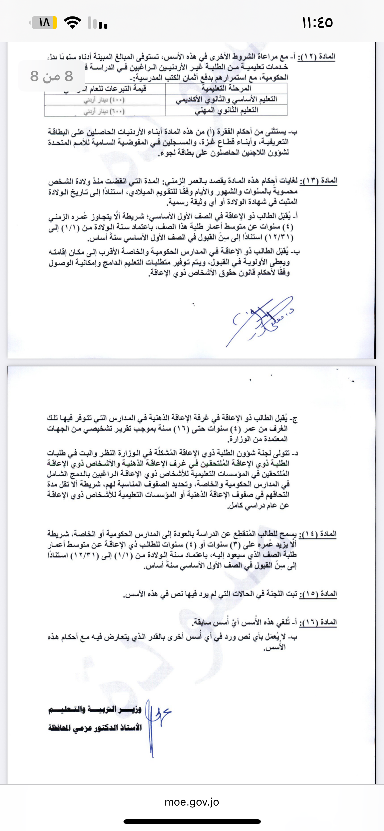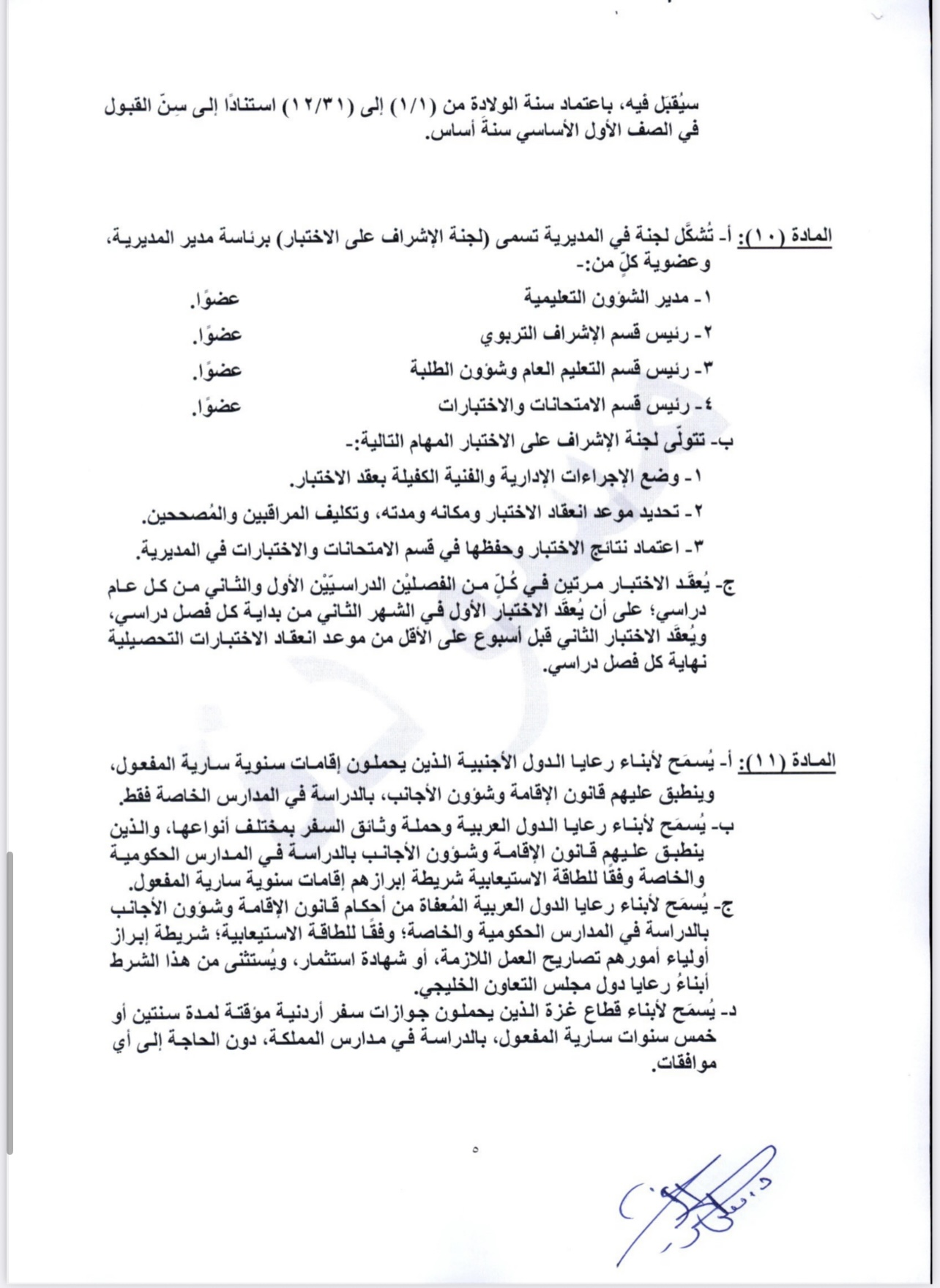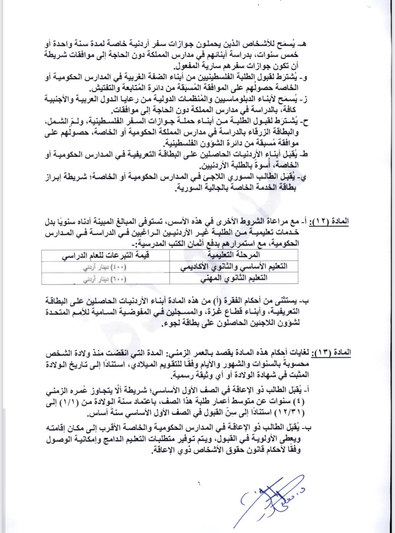 سمحت التعليمات لأبناء الدول العربية والأجنبية المقيمين في الأردن وأبناء قطاع غزة وحملة الوثائق الفلسطينية والسورية بالالتحاق بالمدارس الحكومية والخاصة وفق شروط تتعلق بإبراز الوثائق الرسمية مثل البطاقة الأمنية أو بطاقة الخدمة الخاصة بالجالية السورية. كما أعفي أبناء غزة من دفع رسوم التعليم في المدارس الحكومية.
