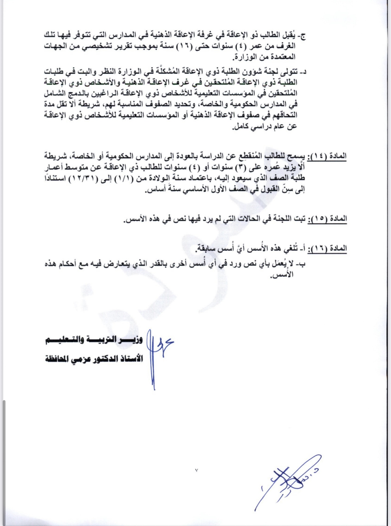 شددت التعليمات على أولوية قبول الطلبة من ذوي الإعاقة في المدارس الحكومية والخاصة، مع التأكيد على توفير متطلبات التعليم الدامج من حيث البيئة المدرسية المناسبة والمناهج وطرق التدريس. كما أُتيح قبول الطلبة ذوي الإعاقة الذهنية حتى سن السادسة عشرة وفق تقارير طبية رسمية معتمدة من الجهات المختصة.