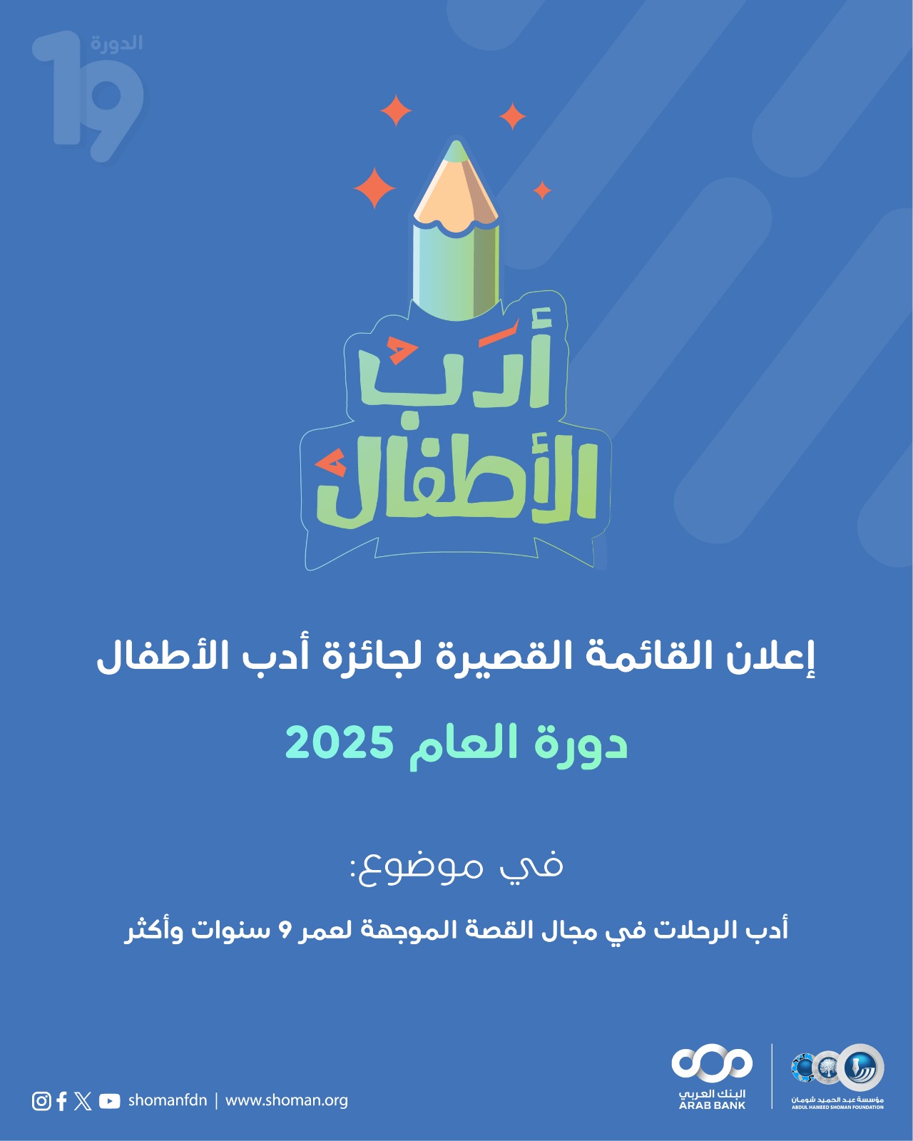 عمان جو– أعلنت مؤسسة عبد الحميد شومان، اليوم، القائمة القصيرة لجائزتها لأدب الأطفال، للدورة 19 في موضوع "أدب الرحلات في مجال القصة الموجهة للأطفال في الفئة العمرية 9 سنوات وأكثر "، مؤكدة أن إعلان أسماء الفائزين بالمراتب الثلاث للجائزة سيكون في نهاية شهر آب.