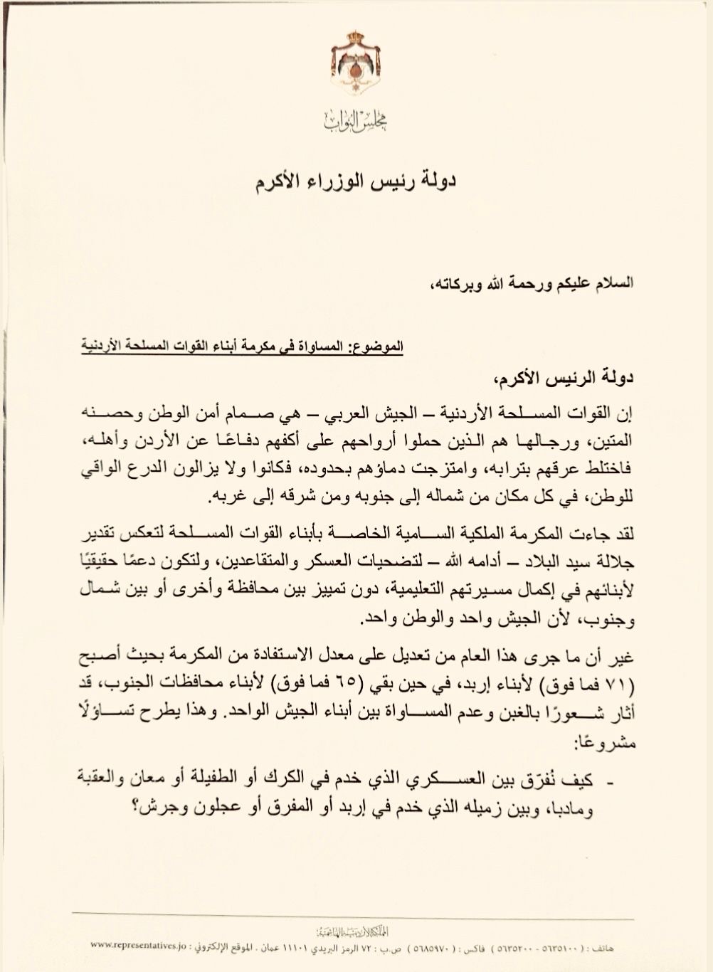 وأكد القبلان في مذكرته أن القوات المسلحة الأردنية – الجيش العربي – هي صمام أمان الوطن وحصنه المنيع، وأن أبناءها الذين قدموا أرواحهم دفاعًا عن الأردن يستحقون العدالة والمساواة في التعليم ومواصلة مسيرتهم الأكاديمية، مشددًا على أن التمييز في النسب يثير شعورًا بعدم المساواة بين أبناء الجيش الواحد.