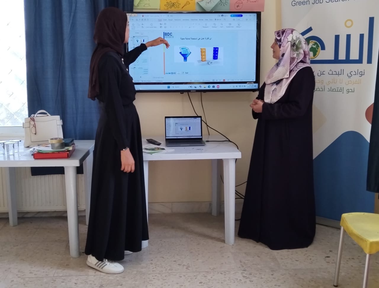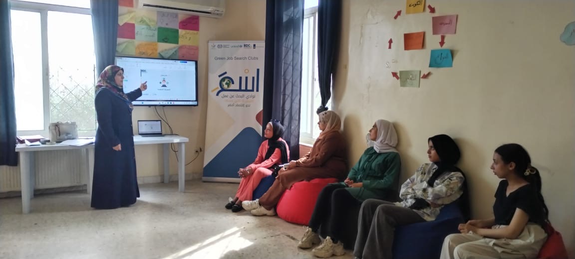 حيث قامت المدربة فاطمة البطاينة بتوجيه المشاركات نحو المهن الخضراء في الاقتصاد الاخضر في قطاعات انتاج وتوزيع الطاقة والمياه وقطاع الصرف الصحي ومعالجة النفايات وقطاع حماية الطبيعة والبيئة؛ لتنشيط الشابات واشراكهن في أنشطة البحث عن عمل وركزت على اهمية تسويق الذات والمهارات المرتبطة في البحث عن عمل،