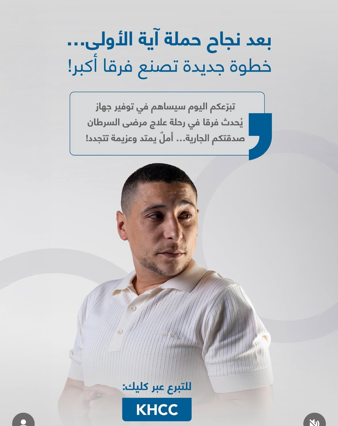 فبعد النجاح الكبير الذي حققته المرحلة الأولى من حملة آية والتي أسهمت في علاج عدد من المرضى في مركز الحسين للسرطان أعلن المنسي انطلاق المرحلة الثانية من الحملة التي تهدف إلى تأمين أجهزة طبية متخصصة وتغطية تكاليف علاج عدد من الحالات الحرجة داخل المركز تأكيدًا على أن العمل الإنساني يجب أن يستمر بروح الأمل والإصرار.