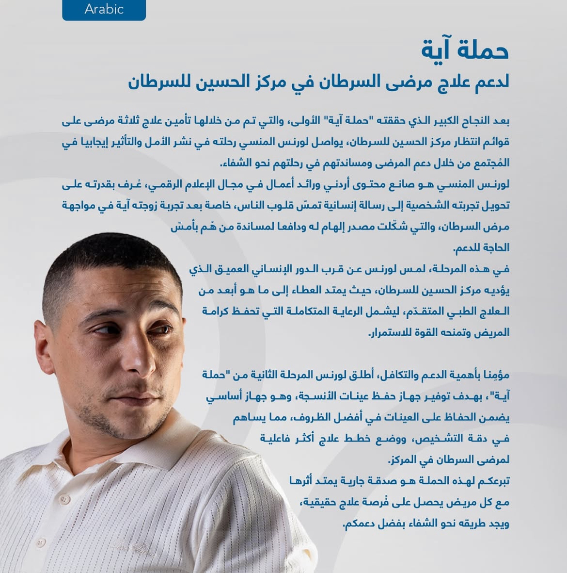 لورنس المنسي الذي يعد من أبرز صناع المحتوى في الأردن استطاع أن يوجه أرقام متابعيه الضخمة على مواقع التواصل نحو أهداف إنسانية ووطنية نبيلة حيث سخر منصاته لنشر قصص النجاح والأمل ودعوة المجتمع إلى التكاتف لدعم المرضى المحتاجين وأكد المنسي أن هدفه من الحملة هو تحويل الحب الرقمي إلى طاقة إنسانية تخدم الوطن والمجتمع لأن الشهرة بلا إنسانية لا قيمة لها.