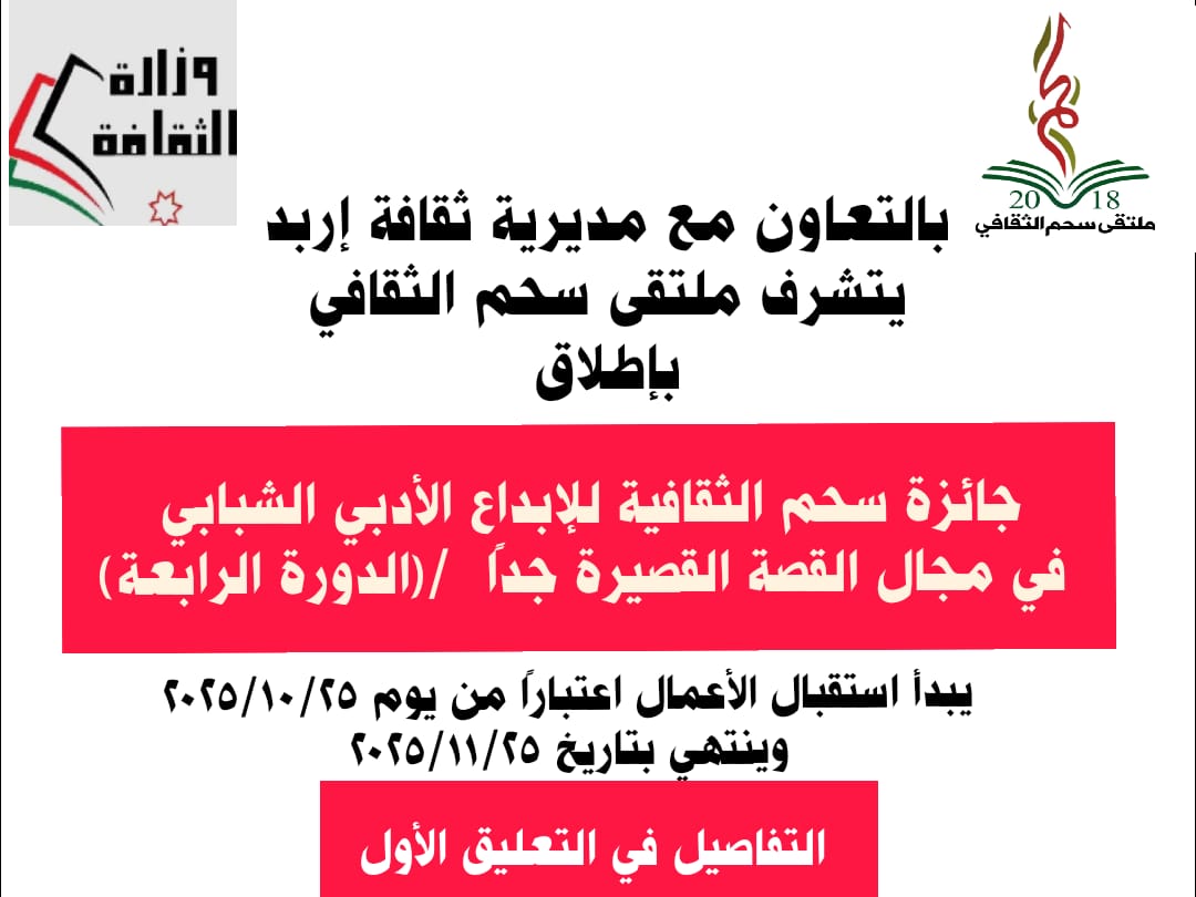 ملتقى سحم الثقافي يعلن عن جائزة سحم الثقافية للإبداع الأدبي الشبابي الدورة الرابعة 2025 في "القصة القصيرة جدا"